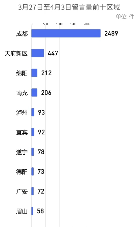 各市州及天府新区的留言量分别为:成都2489件、天府新区447件、绵阳212件、南充206件、泸州93件、宜宾92件、遂宁78件、德阳73件、广安72件、眉山58件、凉山57件、达州57件、内江52件、乐山51件、自贡48件、资阳39件、攀枝花 39件、广元35件、雅安29件、阿坝25件、巴中24件、甘孜11件。