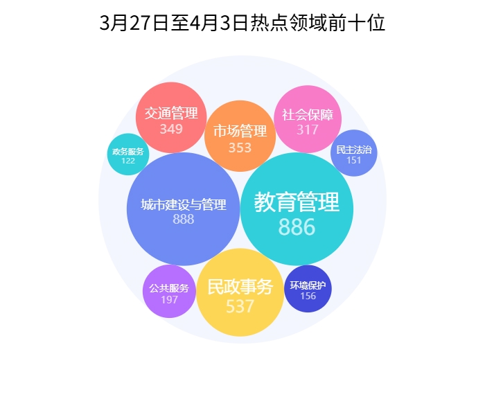 网民留言领域前十分别为:城市建设与管理888件、教育管理886件、民政事务537件、市场管理353件、交通管理349件、社会保障317件、公共服务197件、环境保护156件、民主法治151件、政务服务122件。
