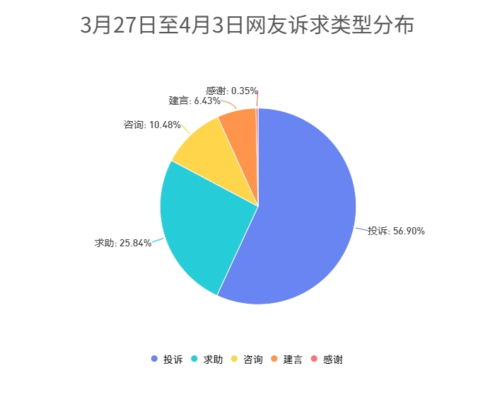 留言类型中投诉类最多,共2574件,占比56.90%;第二为求助类1169件,占比25.84%;第三为咨询类474件,占比10.48%。此外,建言类291件,感谢类16件。