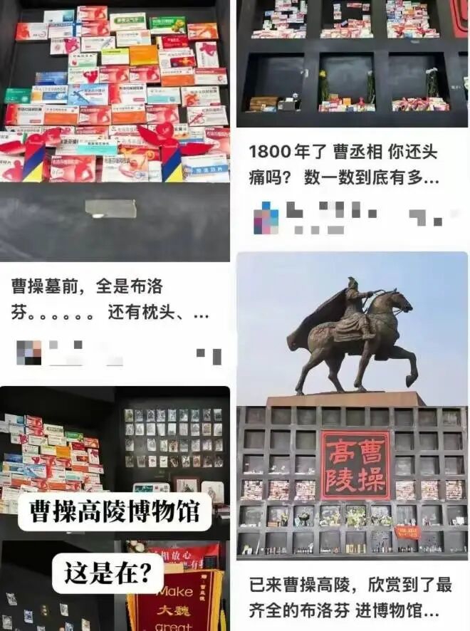 先来看最火的曹操墓。历史上,曹操生前深受偏头痛顽疾折磨,于是,贴心的网友们便送上了布洛芬,戏称这是“迟到了一千八百年的救命药”,比当年华佗提议的“开颅手术”管用多了。