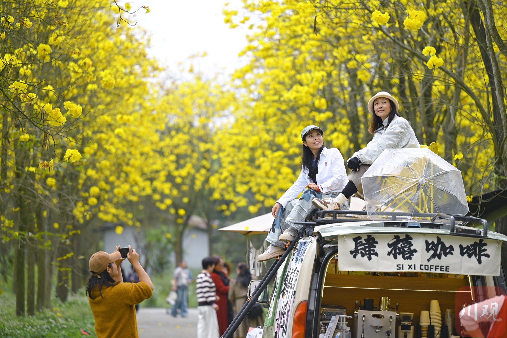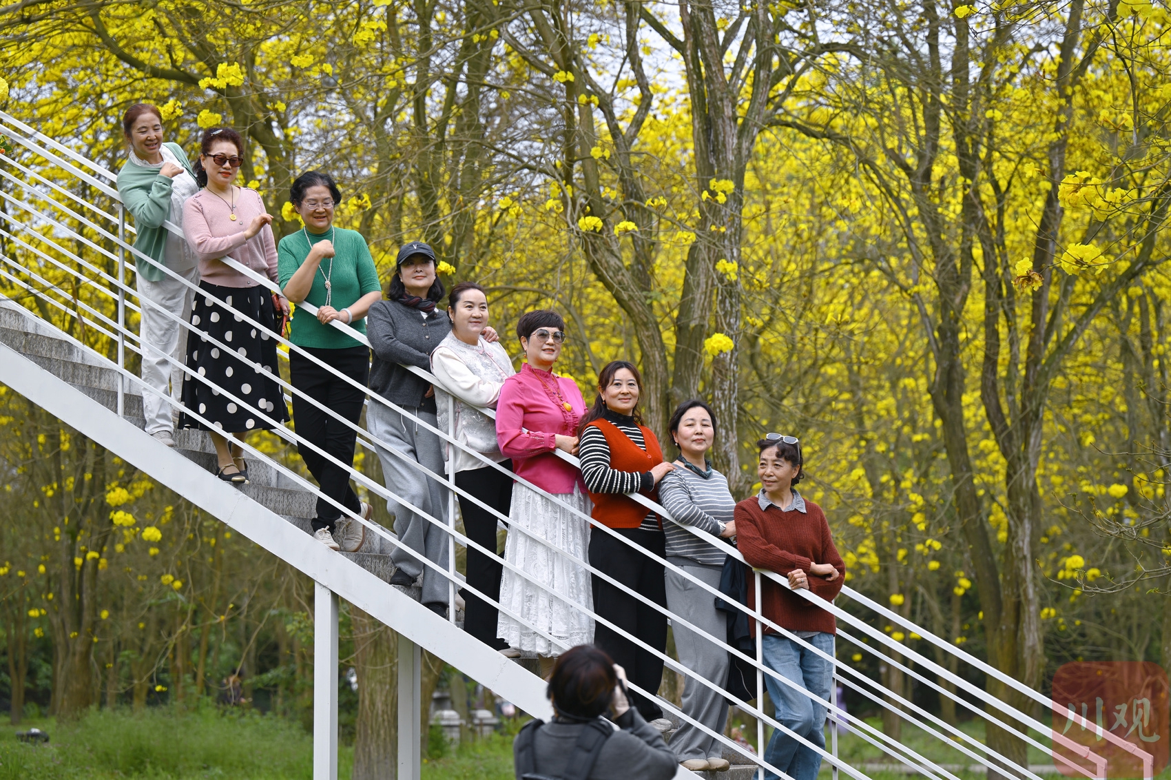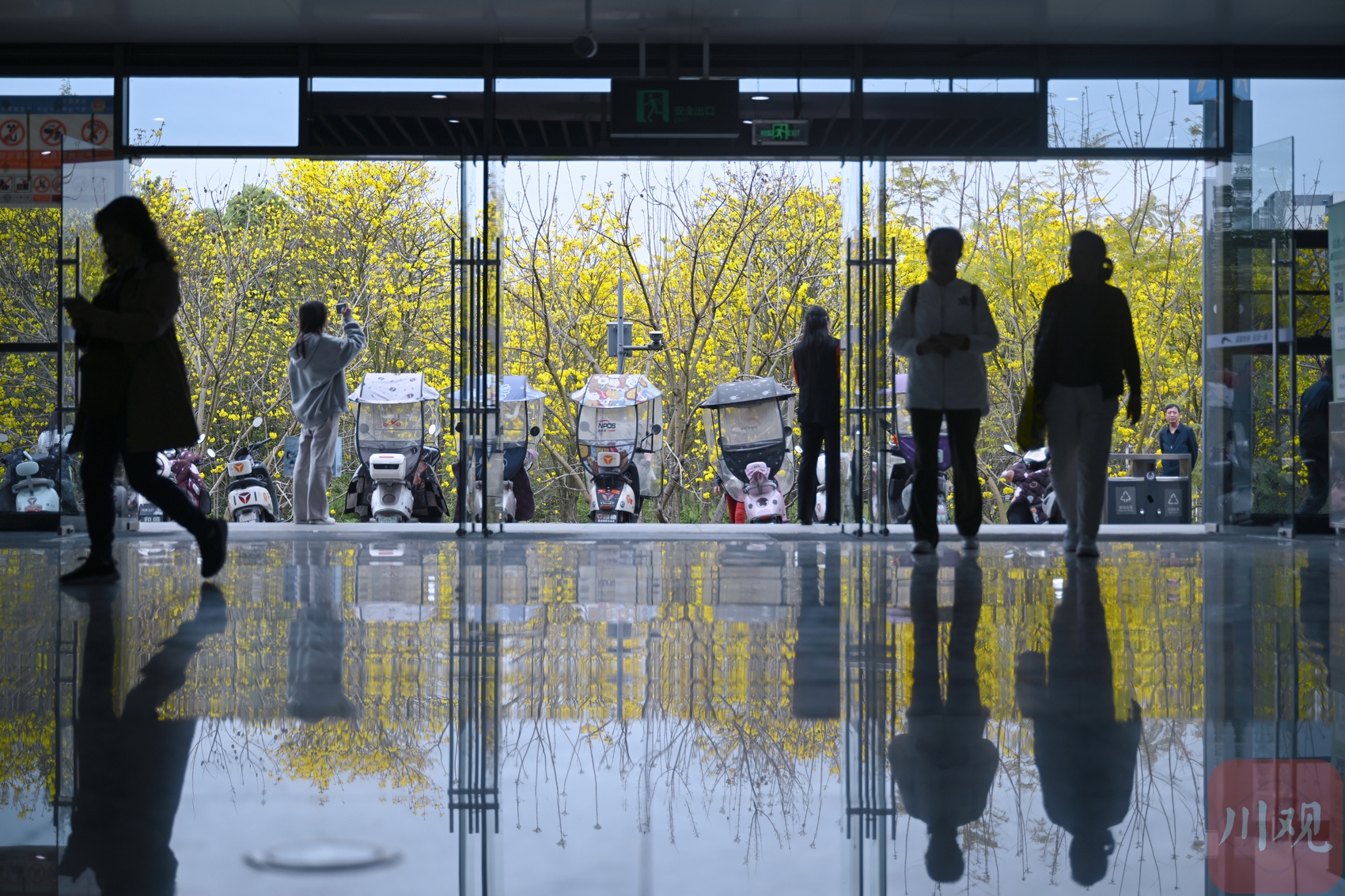 游客在金星地铁站拍摄盛开的黄花风铃木