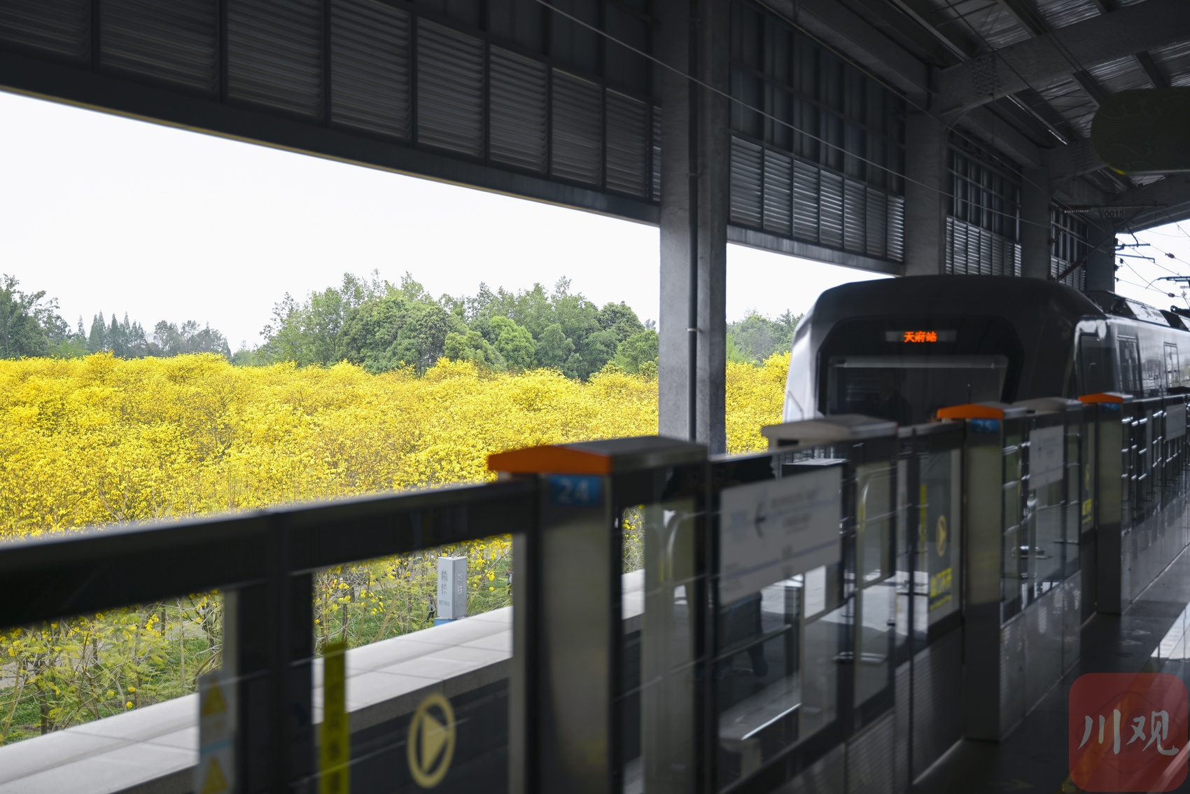 地铁19号线列车从金色花海旁驶过