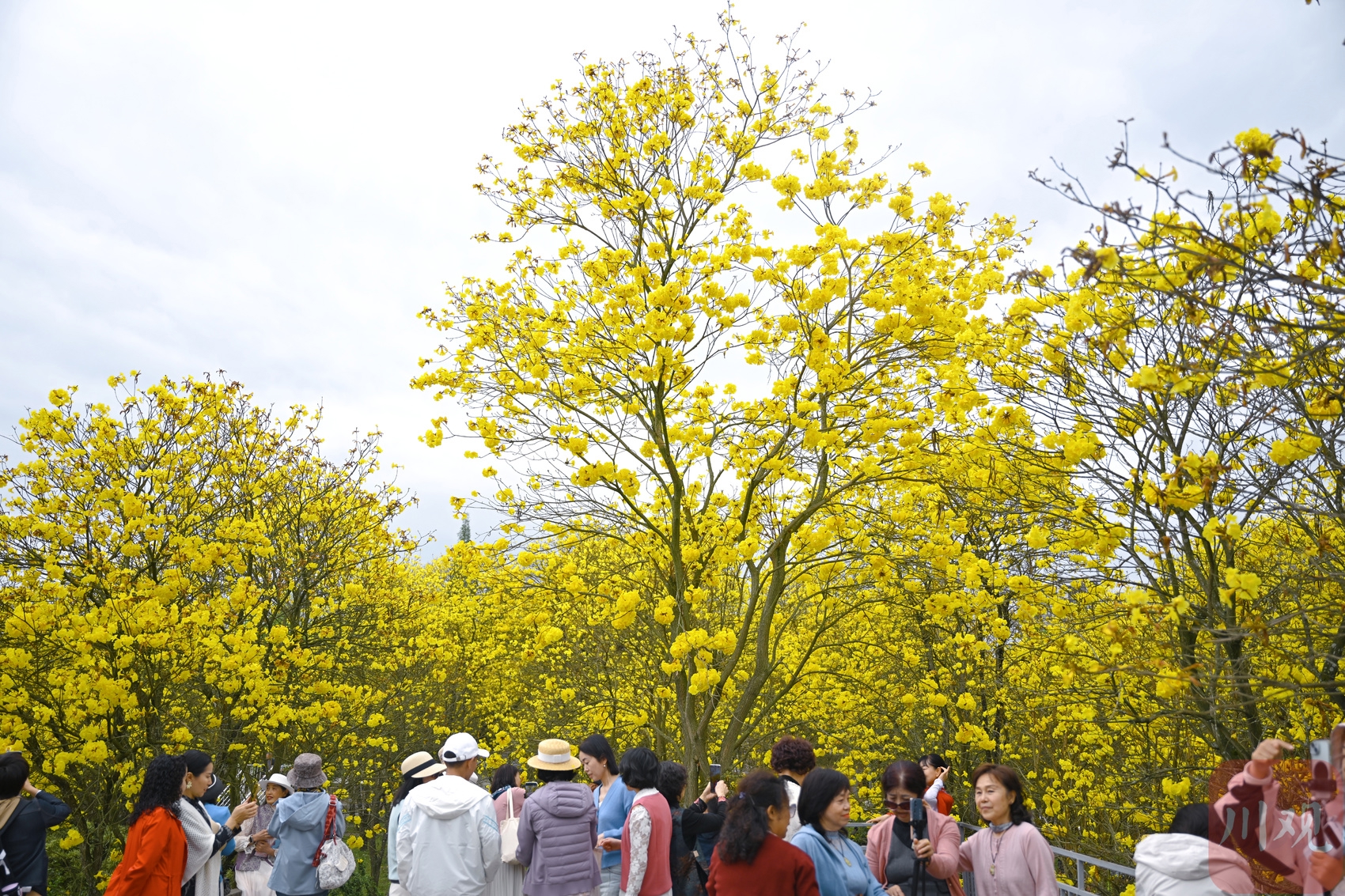 据了解,黄花风铃木原产南美洲,花期约10至15天,目前正值最佳观赏期。凭借纯粹的金黄花色与优美的树形,再加上地铁交通的便捷,这片花海已成为温江区新晋的网红打卡地。