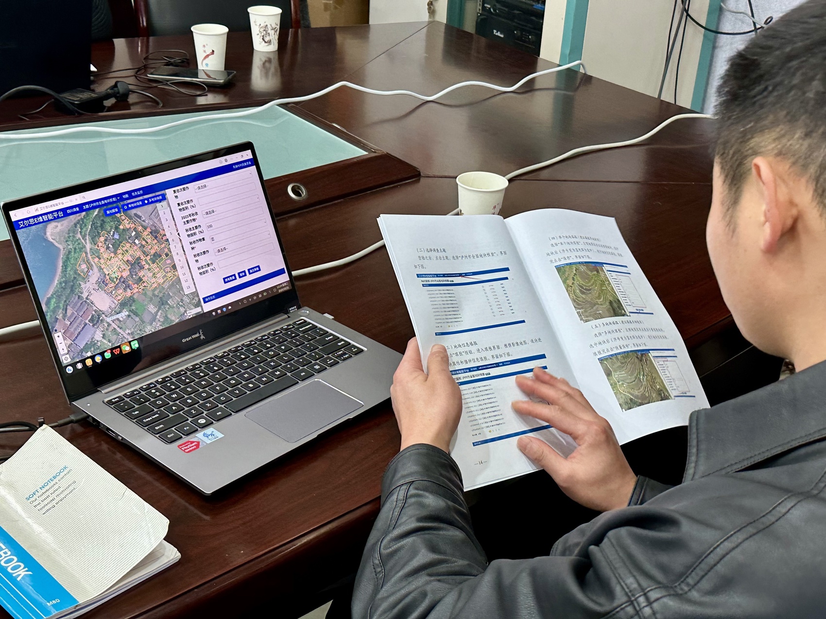 一张张卫星图在屏幕上不断切换、放大、移动,田埂、沟渠和地块边线走向清晰可见,这是“卫星看”的成果,也是“AI算”迈出的第一步。办公桌一侧,还放着《方山镇第四次全国农业普查遥感测量工作手册》等资料。对着屏幕进行核对的普查员,都是熟悉本地情况的乡镇、村组工作人员。