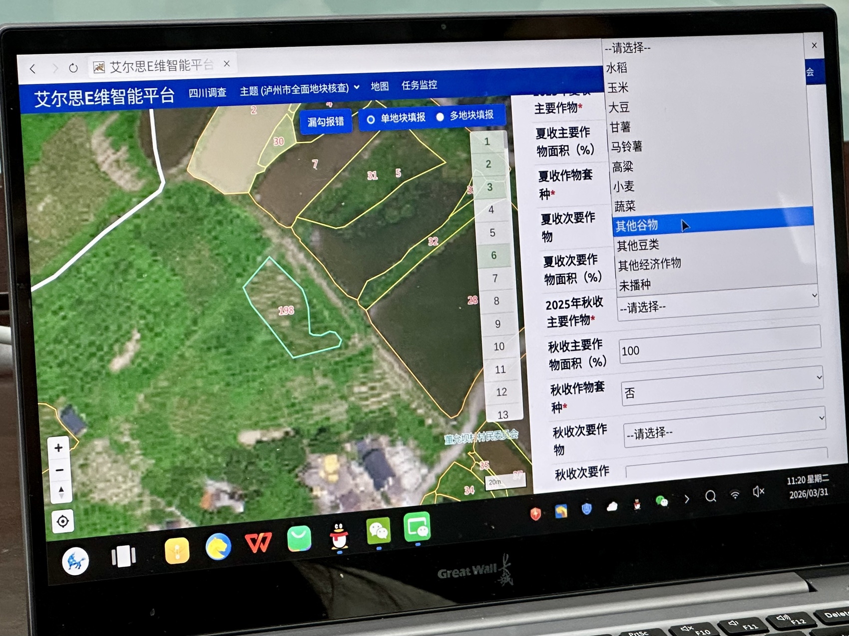泸州市江阳区方山镇白塔村一间办公室里,几台电脑一字排开。屏幕上是一幅幅被放大的卫星影像:田块边界被AI自动勾勒出来,顺着田埂、沟渠弯折延伸。普查员盯着屏幕,放大、核对、标注,AI勾画是否压准了边界?地块属性是什么?鼠标轻点,一一核准。