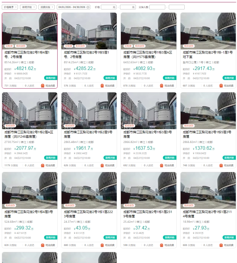 近日,阿里司法拍卖平台挂出的多则拍卖信息,将“成都市锦江区梨花街2号‘盐市口广场’”重新推入公众视野。这个承载了成都人二十余年商业记忆的地标建筑,如今被拆分为多个标的物,将于4月27日开始拍卖,所有标的起拍总价约2.36亿元。拆分后单笔最高起拍价为4821.62万元,最低起拍价为27.93万元。