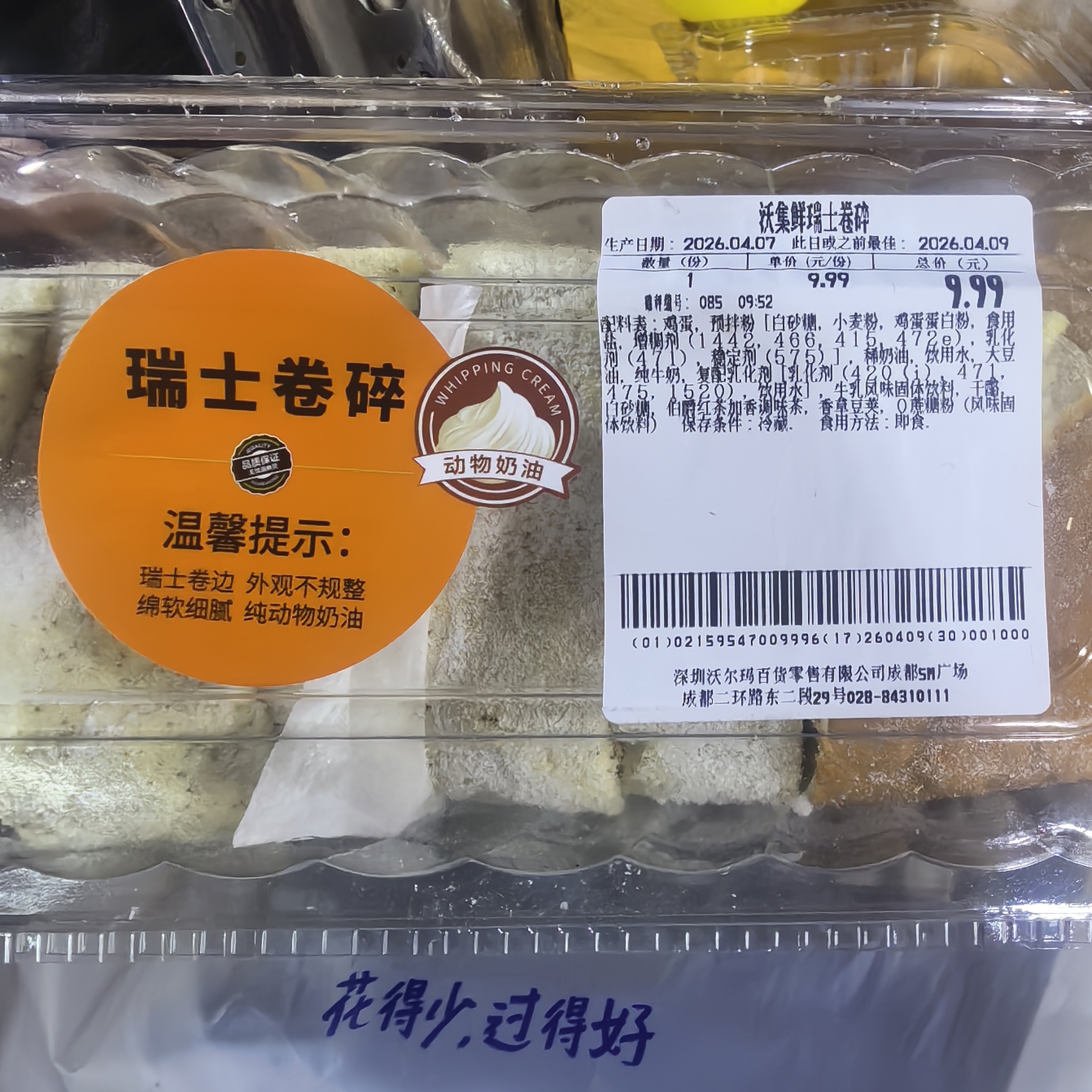 4月8日中午,记者来到沃尔玛成都交大路分店,记者看到现场出售的新巧克力味瑞士卷碎,标注的生产日期是4月7日,现场工作人员宣称该瑞士卷碎是现制的。