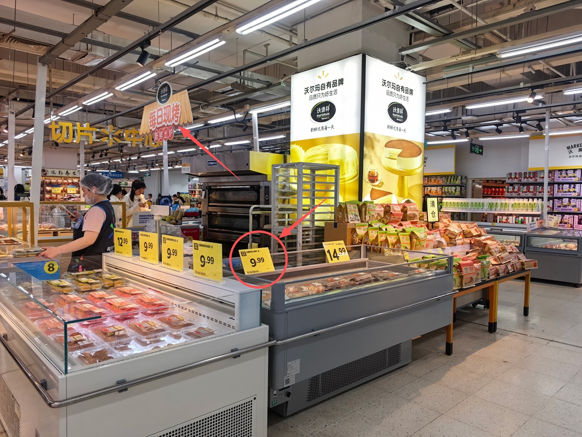 3月29日、4月7日,记者两次走访成都建设路沃尔玛门店内,店内工作人员介绍:店内售卖的瑞士卷碎“是山姆超市的边角料,冷冻后拿过来进行包装的”。而现烤现卖的欧包、蛋挞等产品,则摆放在另一侧的玻璃柜中。