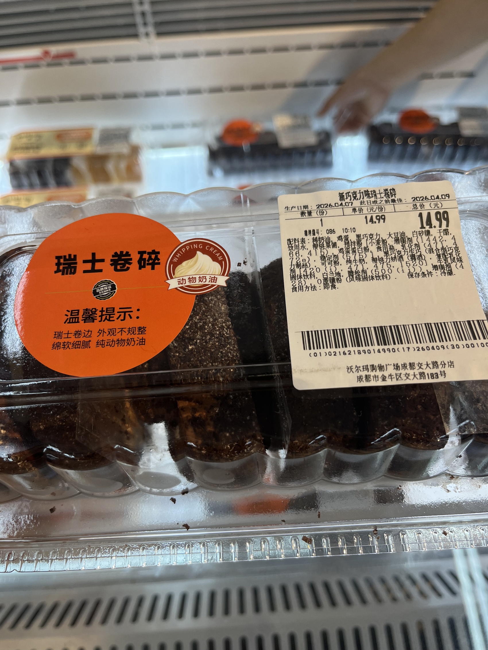 沃尔玛成都交大路分店出售的新巧克力味瑞士卷碎,标注的生产日期是4月7日,现场工作人员宣称该瑞士卷碎是现制的,同时也表示该产品为冷冻后送至门店解冻、包装、贴标签的。