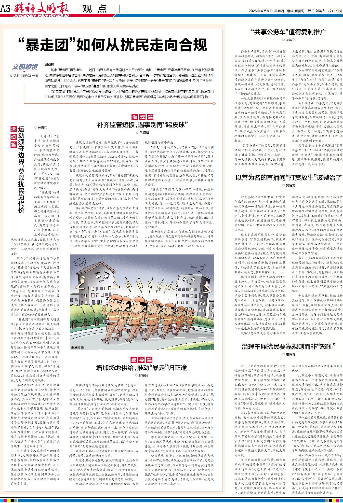 要杜绝“踢皮球”现象,当务之急是厘清权责边界、细化监管规则。当前,多数城市对群体性健身活动的管理,仍停留在原则性倡导层面,对于活动禁止时段、禁止区域、噪声控制标准、聚集报备流程及违规处罚细则等,缺乏具体明确的规定,导致执法者“难下手”、参与者“无底线”。各地需要加快完善管理制度,出台有针对性的细化办法,明确“暴走团”的活动禁区、时段、噪声管控阈值和专人监管责任,将柔性引导转化为刚性约束,推动健身活动在规则框架内有序开展。