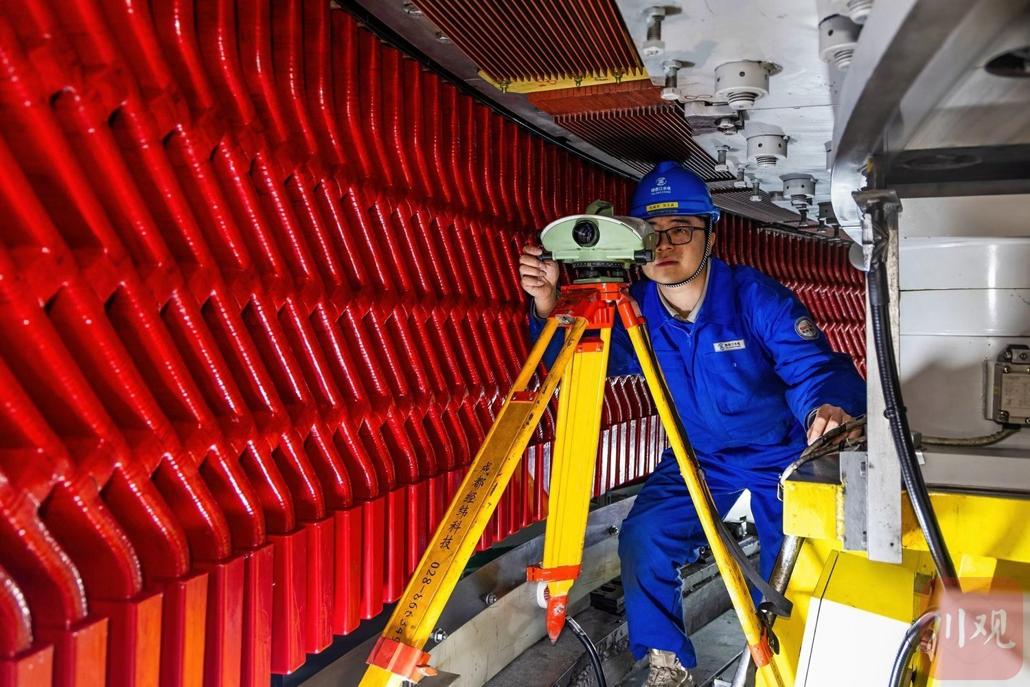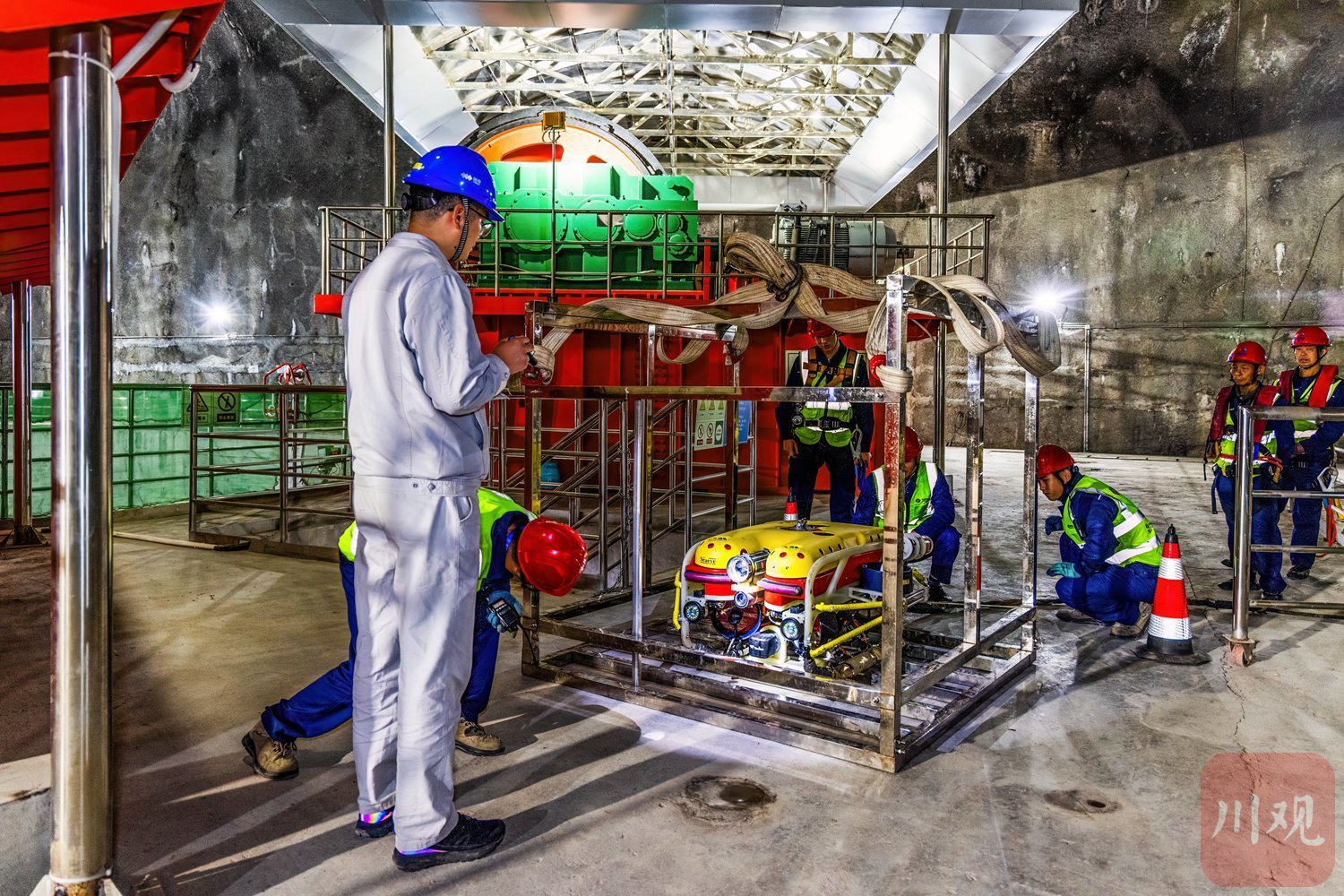 凉山州冕宁县锦屏二级水电站,技术人员对引水隧洞水下机器人进行作业前调试,该机器人用于检查隧洞混凝土衬砌表观缺陷,为这座拥有世界最大规模水工隧洞群、总装机 480 万千瓦的巨型水电站筑牢安全防线。