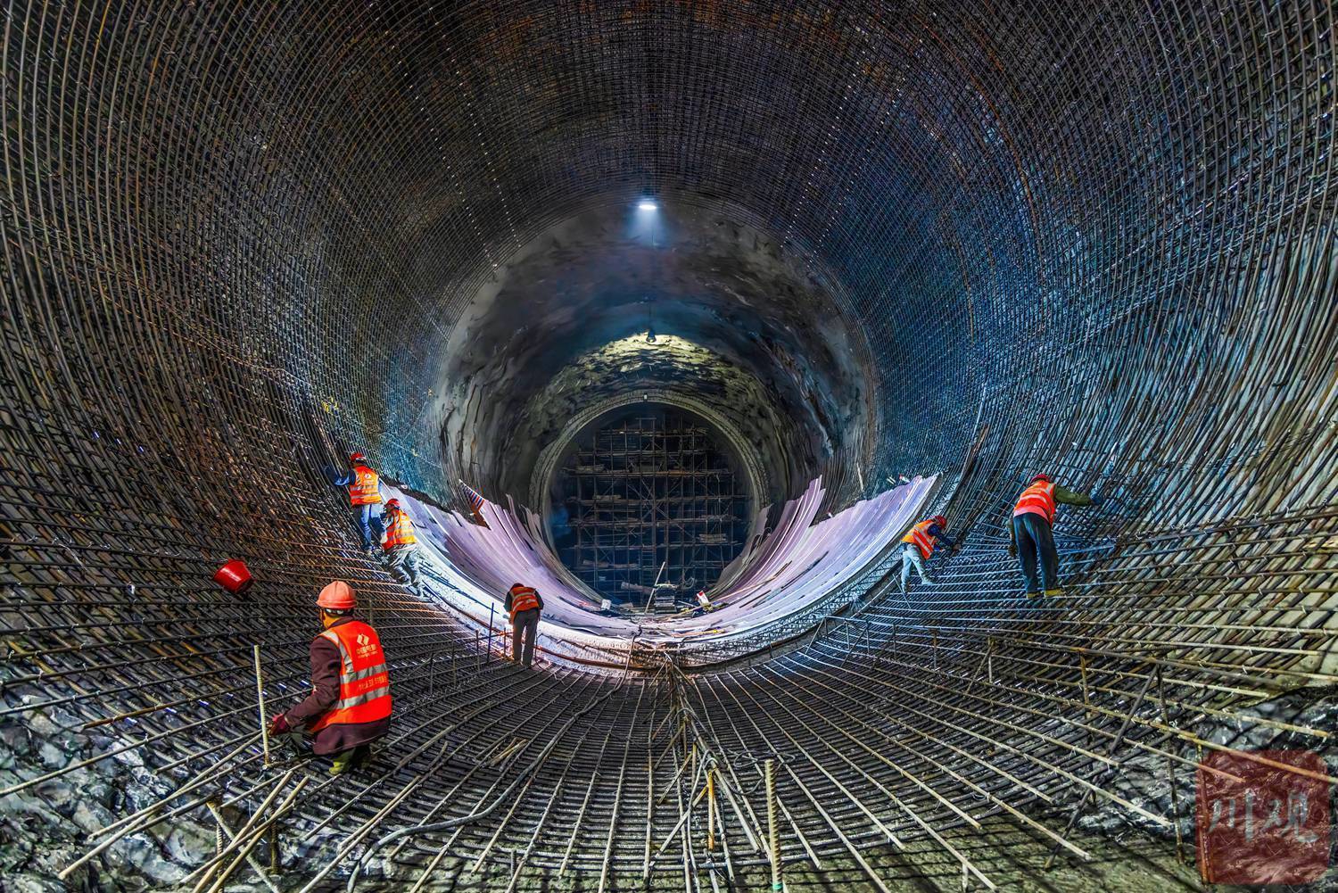 凉山州木里县卡拉水电站地下隧洞施工现场,建设者们在巨型钢筋骨架上开展绑扎作业。