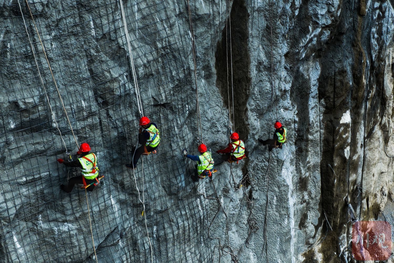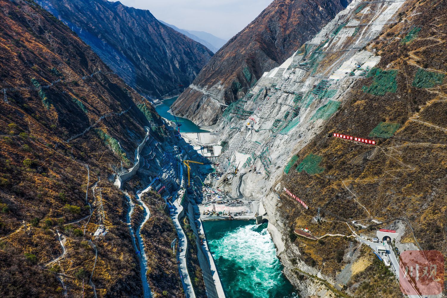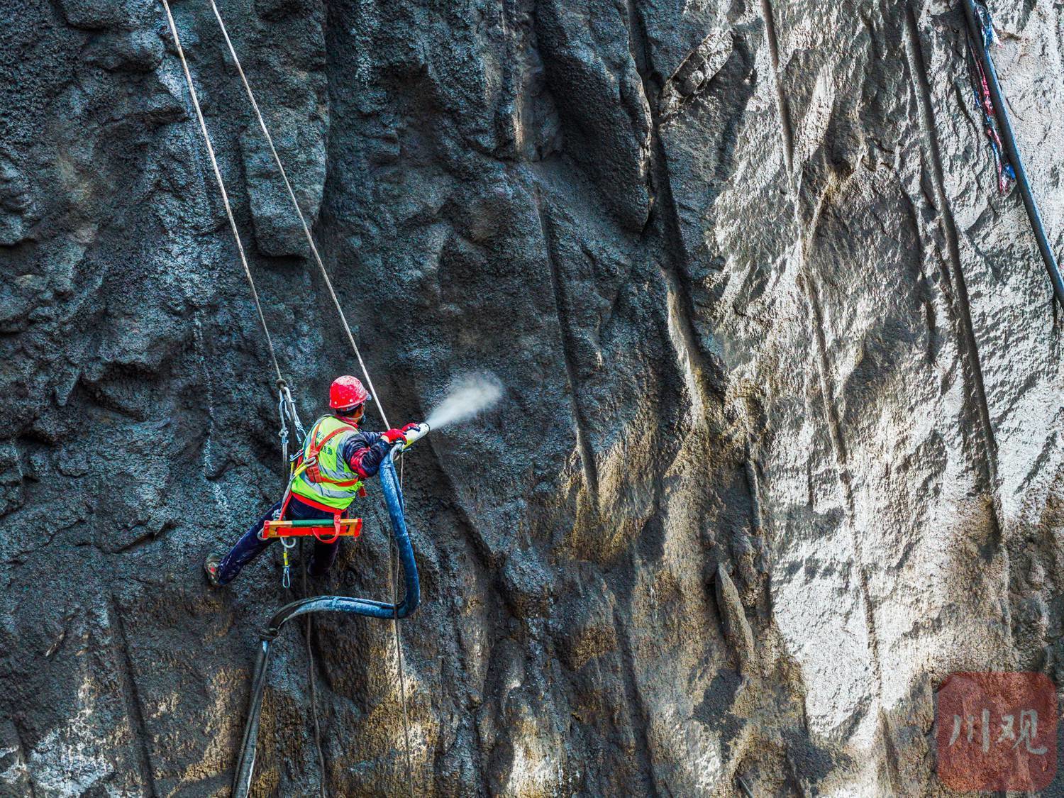 甘孜州九龙县和凉山州木里县孟底沟水电站建设现场,建设者在悬崖峭壁上进行边坡防护施工,全力推进这座总装机 240 万千瓦、位列国内在建最大水电站之一的项目建设。