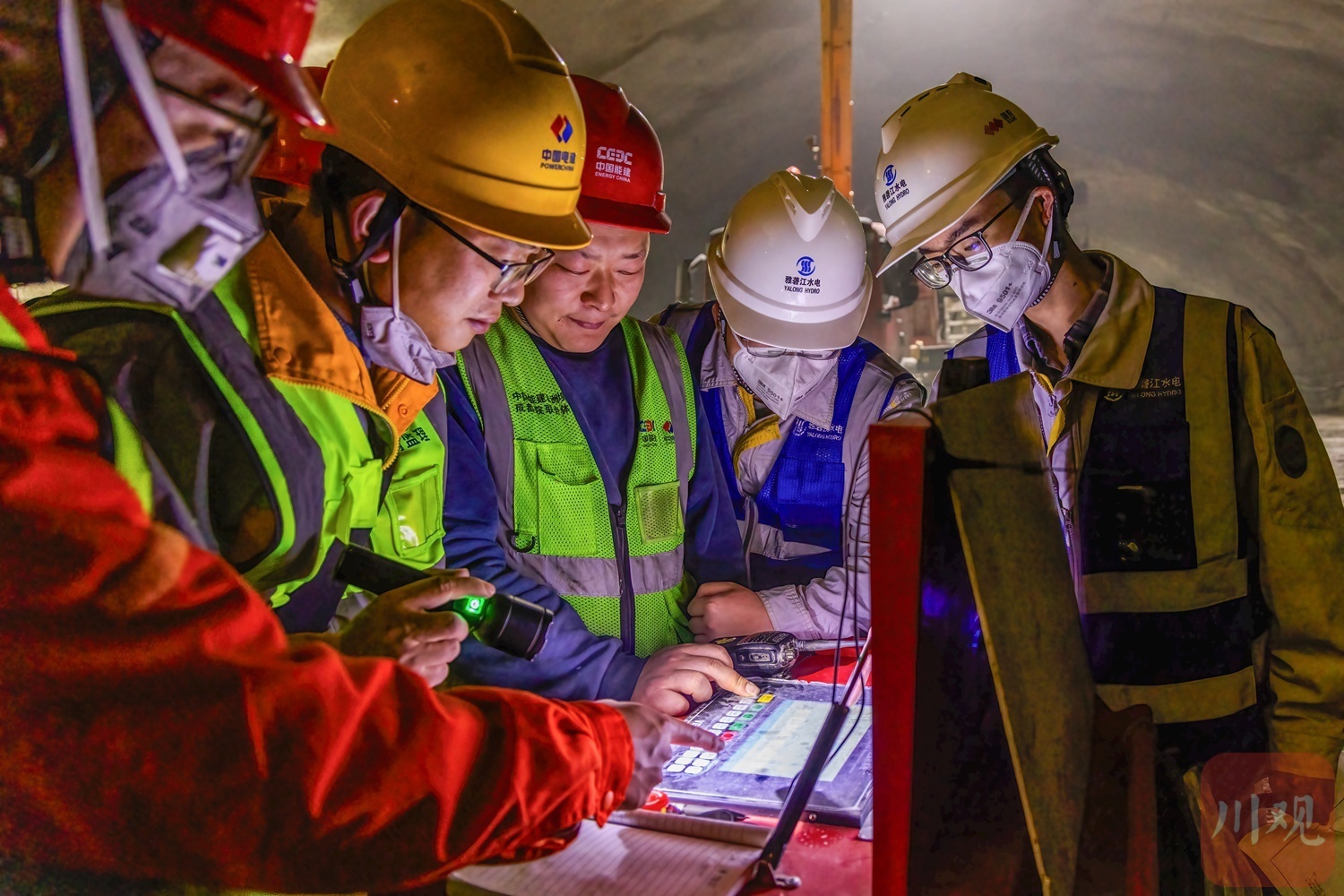 甘孜州九龙县和凉山州木里县孟底沟水电站施工现场,建设者们围绕施工设备研讨技术方案。