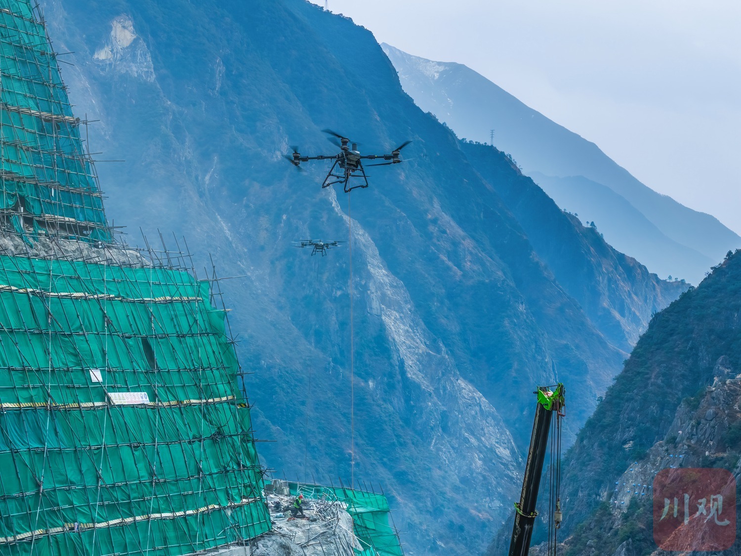 甘孜州九龙县和凉山州木里县孟底沟水电站施工现场,无人机承担高危区域物资运输任务。