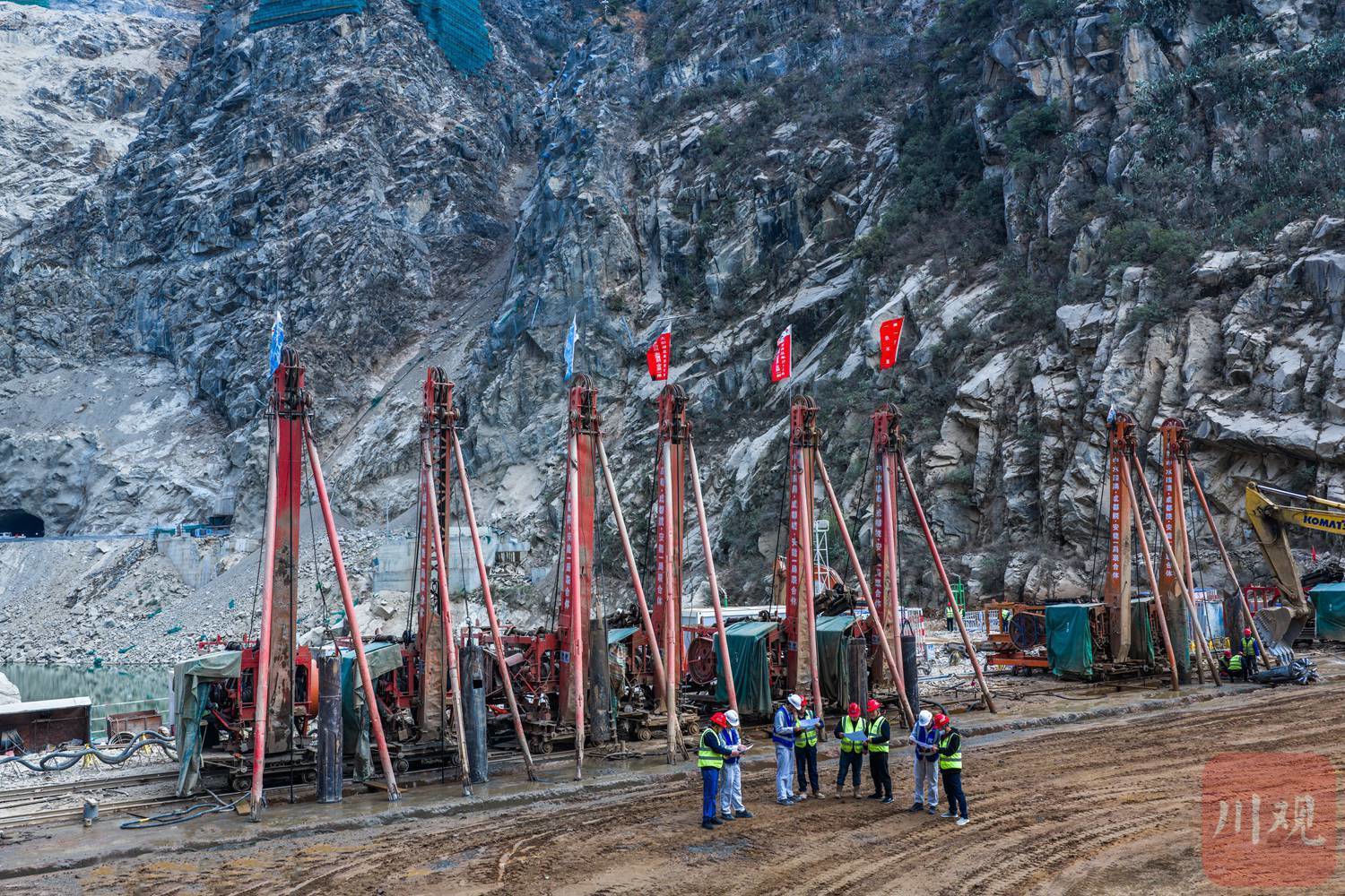 甘孜州九龙县和凉山州木里县孟底沟水电站施工现场,建设者们在钻机群旁研讨施工方案。