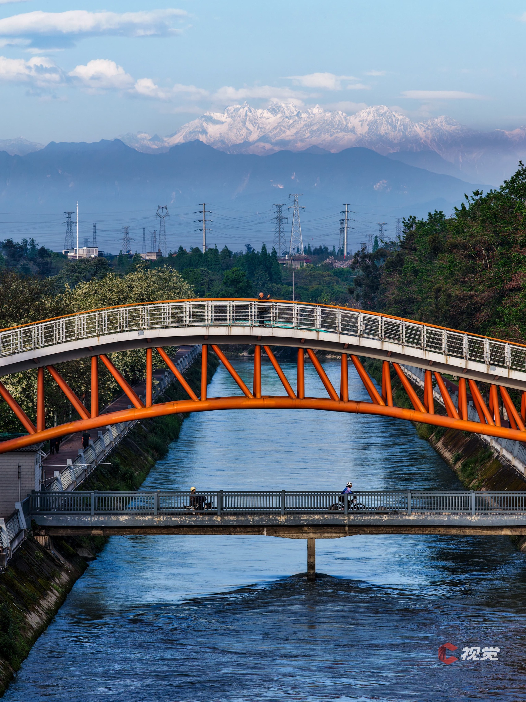 4月9日,在成都彭州升平桥上遥望云端雪山,行人驻足拍摄留影。C视觉签约摄影师 张勇