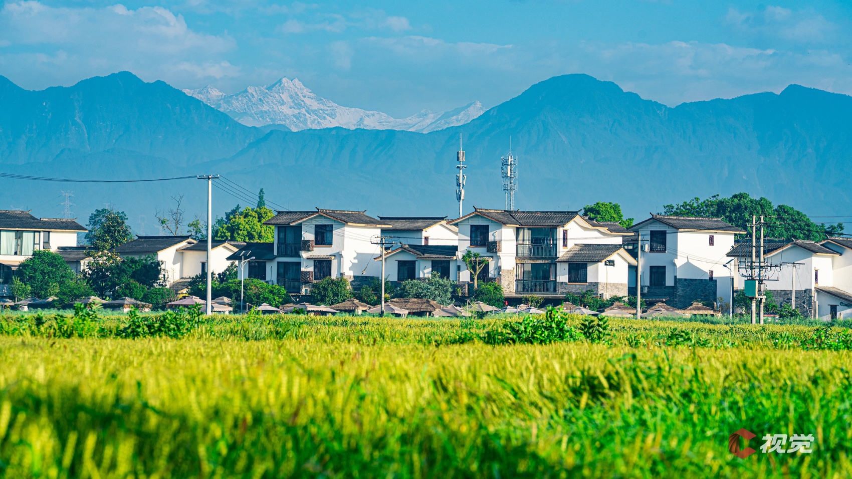 4月9日,成都崇州五星村,皑皑雪山与绿色田野同框。C视觉签约摄影师 李旭