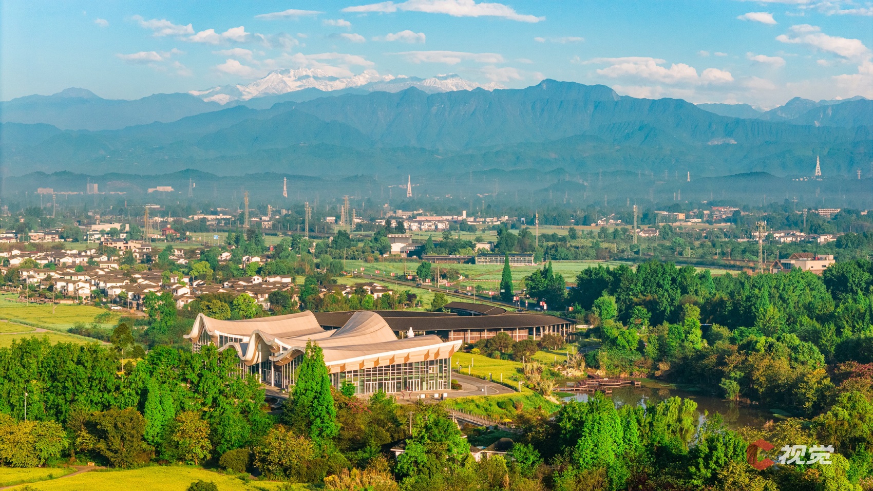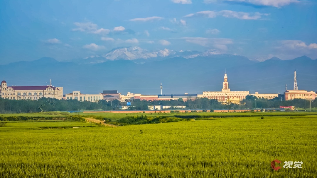 4月9日,在成都大邑县安仁镇的万顷沃野间,西岭雪山群峰巍峨耸立,与安仁影视学院同框。C视觉签约摄影师 黄加荣