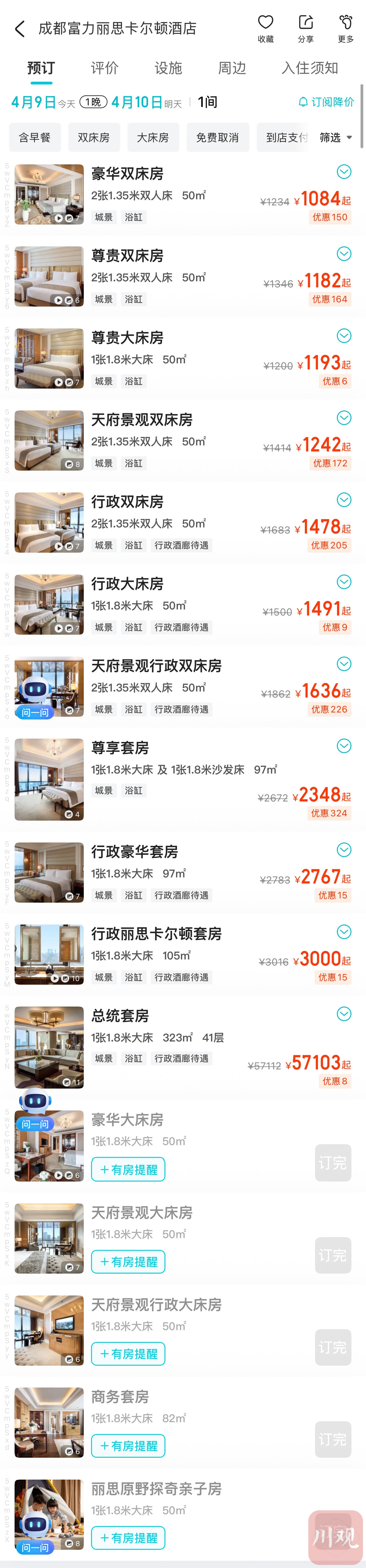 4月9日,成都富力丽思卡尔顿酒店在线上某平台预定情况。