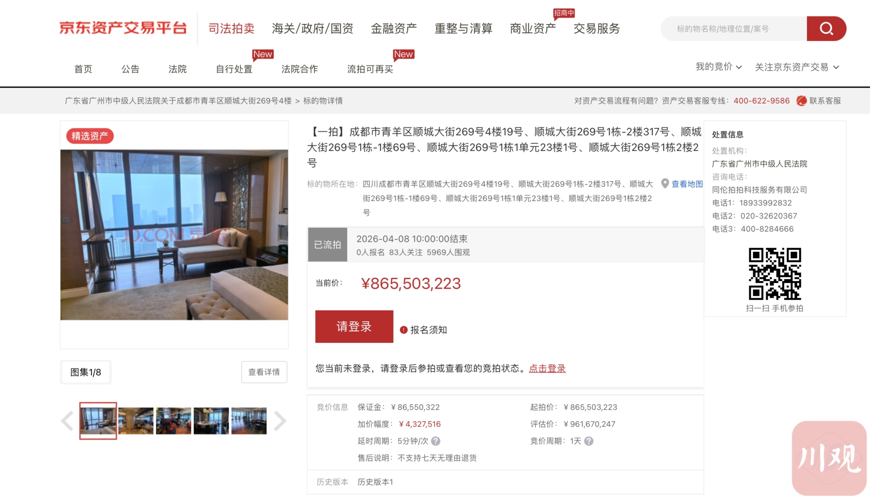 成都富力丽思卡尔顿酒店司法拍卖于4月7日10时起在京东资产交易平台进行,为期24小时,酒店所在的成都市青羊区顺城大街269号多处房产标的物公开拍卖,起拍价约8.655亿元(约为评估价9.617亿元的九折)。截至4月8日10时,共吸引近6000人围观、83人关注,但0人报名。