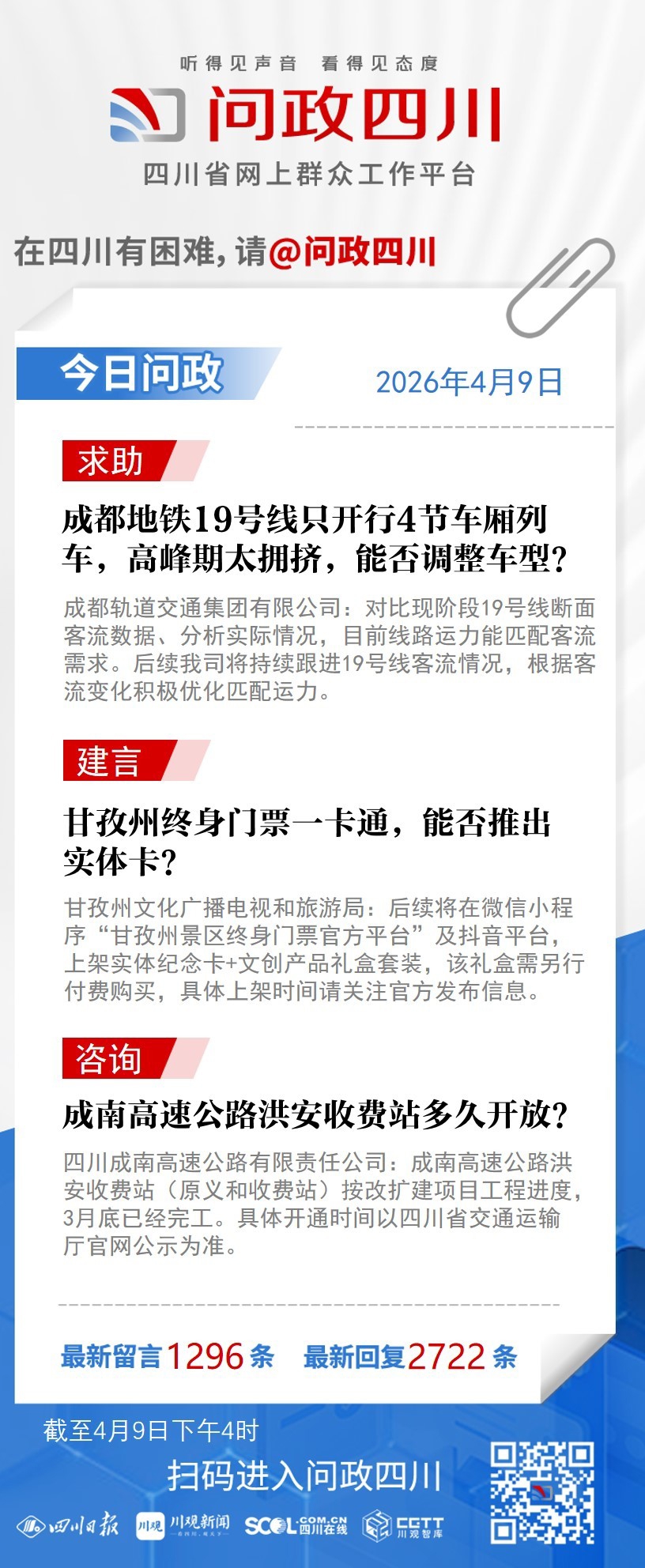 在四川有困难,找问政四川。如果您在四川遇到了操心事、烦心事、揪心事,请登录“四川省网上群众工作平台—问政四川”或拨打问政四川热线(028-96001)留言反映、求助或建议。我们将充分发挥平台的互动联系作用及舆论监督功能,第一时间传递民声,推动问题得以及时解决——听得见声音,看得见态度。