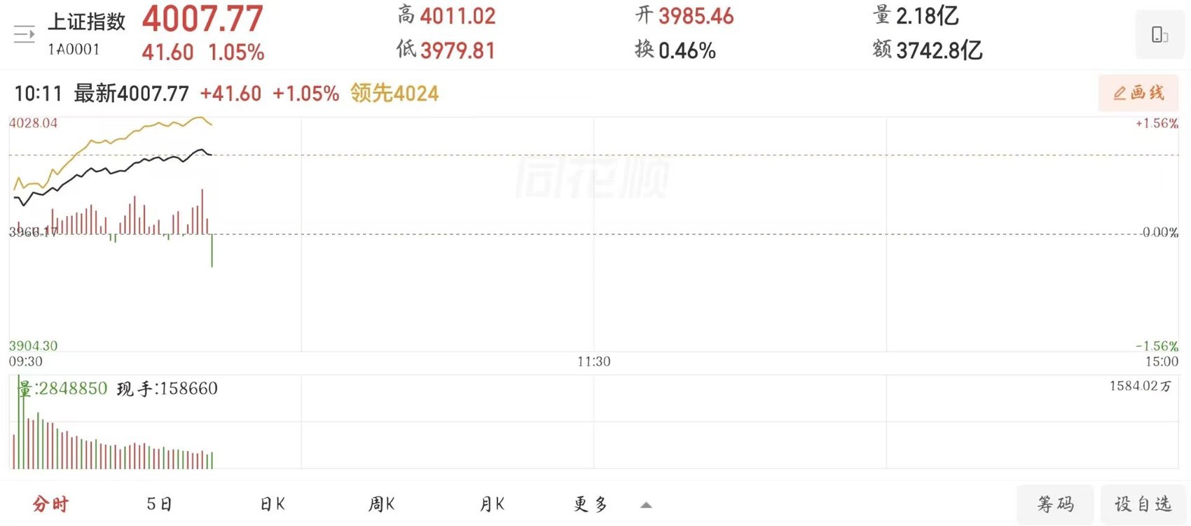 截至10时11分,上证指数报4008.27点,涨幅1.06%,站上4000点整数关口。创业板指表现亮眼,盘中涨幅一度扩大至3.72%,成功突破前期高点,创下2021年12月以来的新高,市场呈现普涨格局。