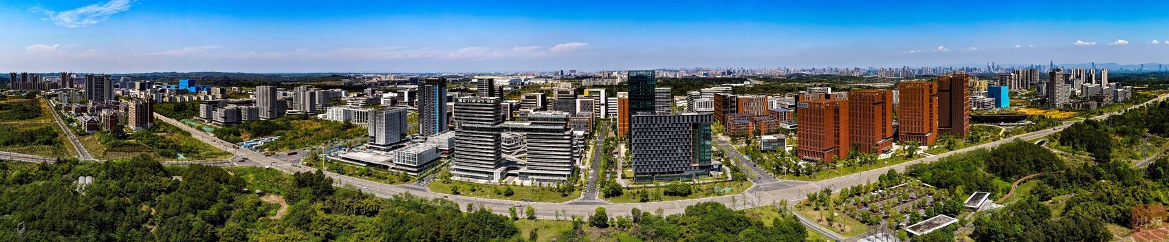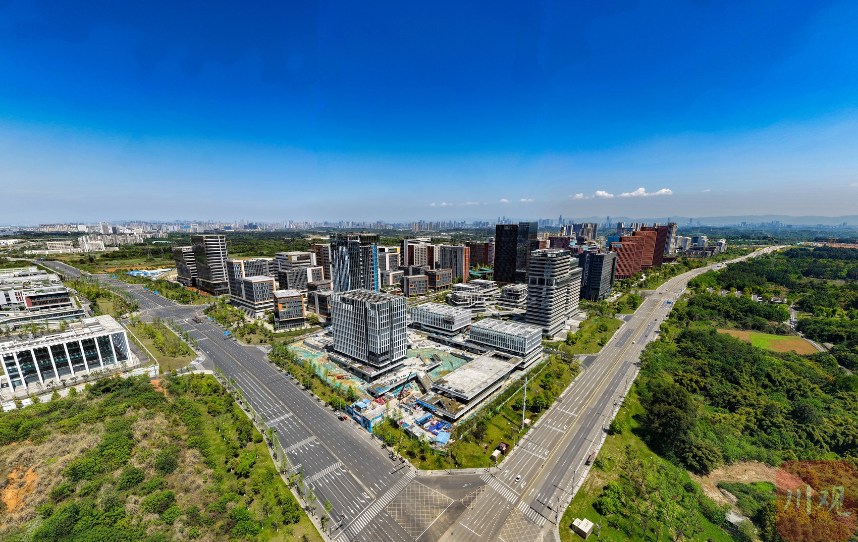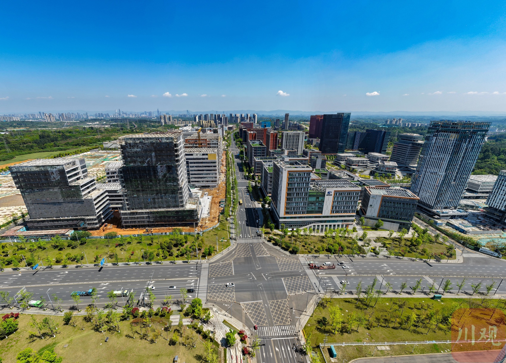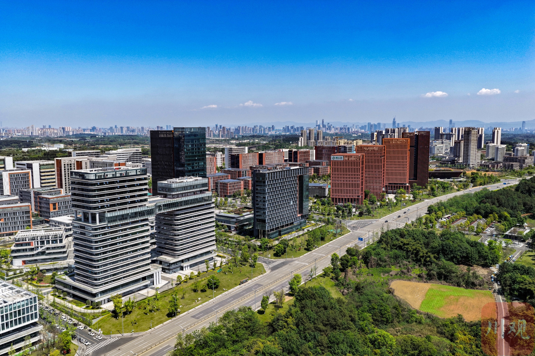 2026年4月9日,记者沿成都剑南大道一路向南,在距离成都市中心约28公里处,用无人机视角俯瞰,只见蓝天白云下,一栋栋风格独特的建筑拔地而起,建筑以橙色和红色为主色调,线条简洁流畅,一座新城正在城南依然崛起。