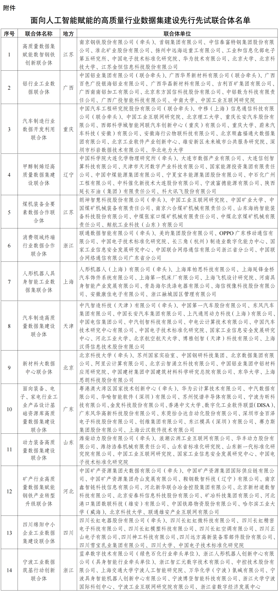 近日,工业和信息化部公布面向人工智能赋能的高质量行业数据集建设先行先试联合体名单,确定了14个先行先试联合体。其中,由四川长虹电器股份有限公司牵头申报的“四川绵阳中小企业工业数据集建设联合体”入选,为省内唯一。