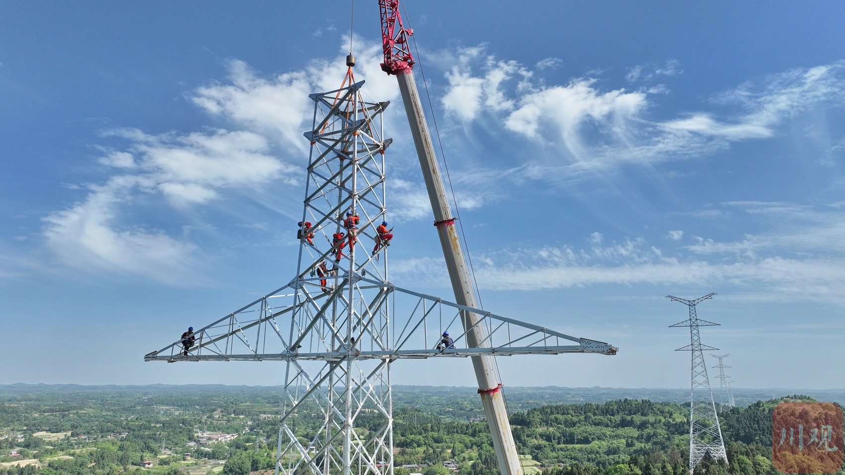 在简阳云龙镇,建设者正在进行空港—淮州双回500千伏线路工程NC21铁塔组立。陈翔 摄