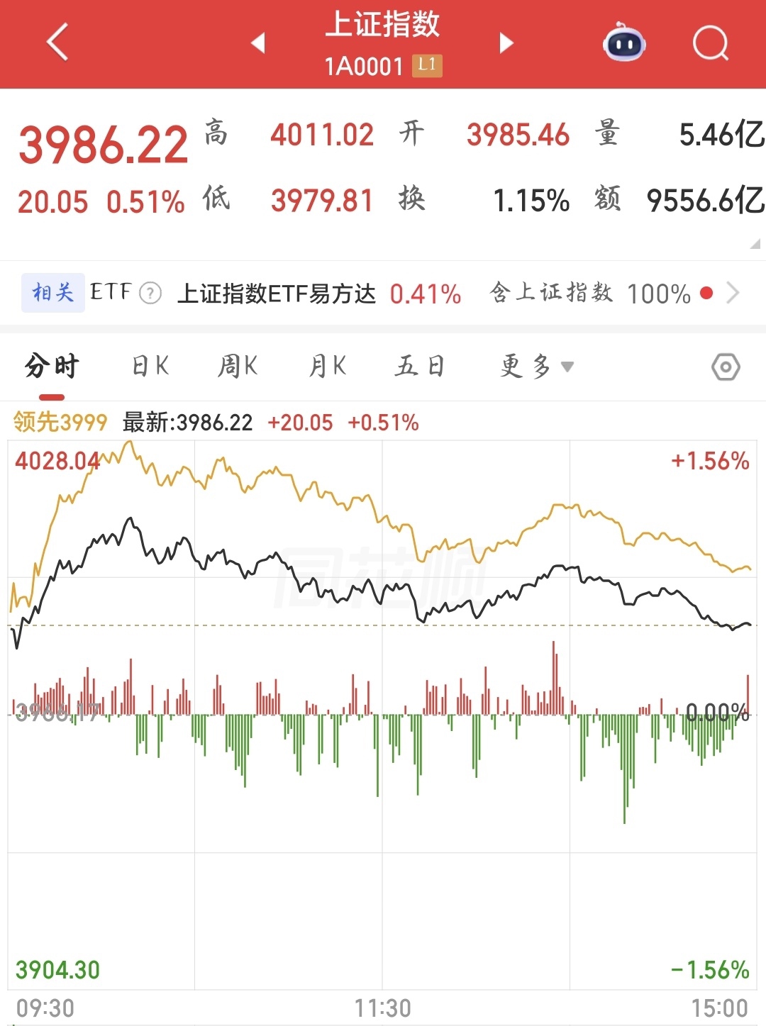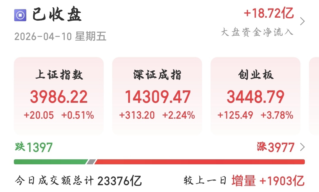截至收盘,上证指数报3986.22点,涨幅0.51%,盘中最高触及4011.02点;深证成指报14309.47点,涨幅2.24%,成功收复14000点关口;创业板指报3448.79点,涨幅高达3.78%,创下2021年12月以来的阶段新高。全市场合计成交额达23376亿元,较前一交易日放量1903亿元,超3900只个股上涨,市场赚钱效应显著提升。