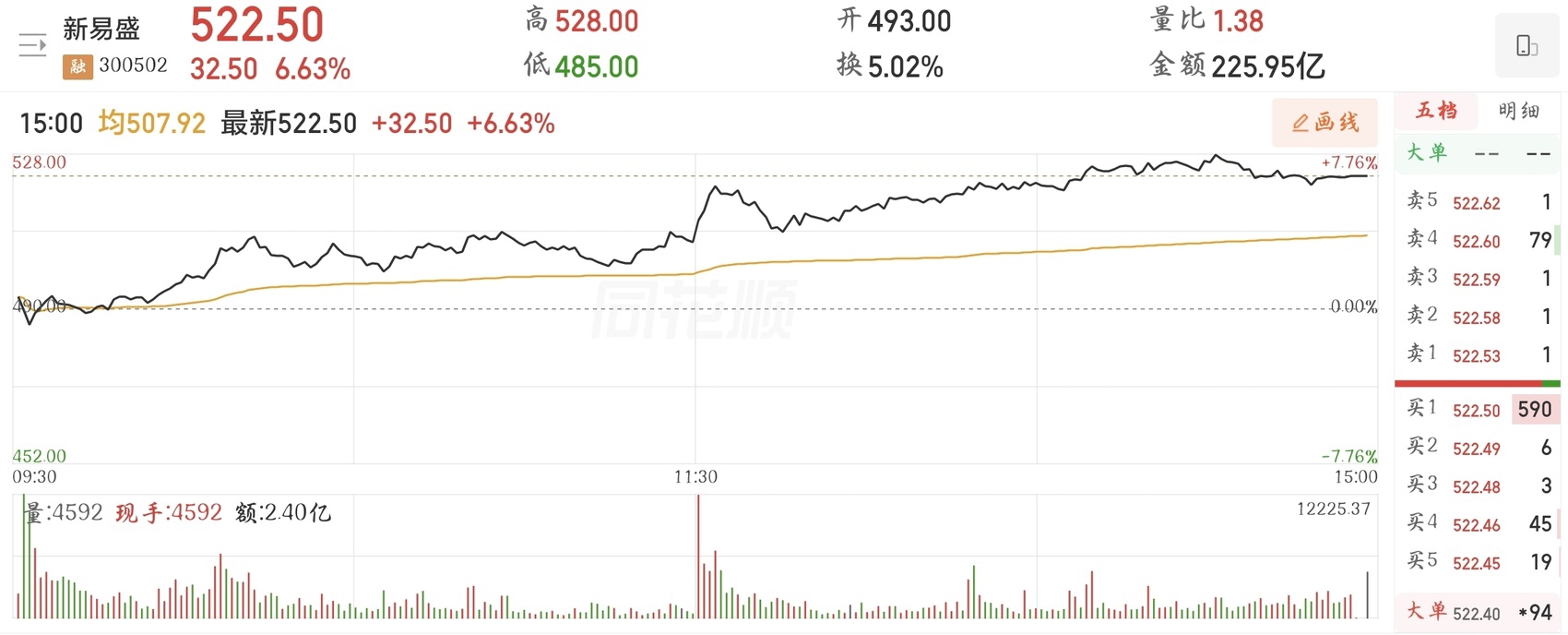 值得一提的是,川股“股价王”新易盛再创新高。作为CPO概念龙头,新易盛高开高走,午后在多头资金推动下股价进一步攀升,盘中最高触及528元,刷新上市以来历史新高。截至收盘,新易盛报522.50元,涨幅达6.63%,成交额高达225.95亿元,总市值首次突破5000亿元大关,来到5193.7亿元,成为成都首家市值站上5000亿元的上市公司。