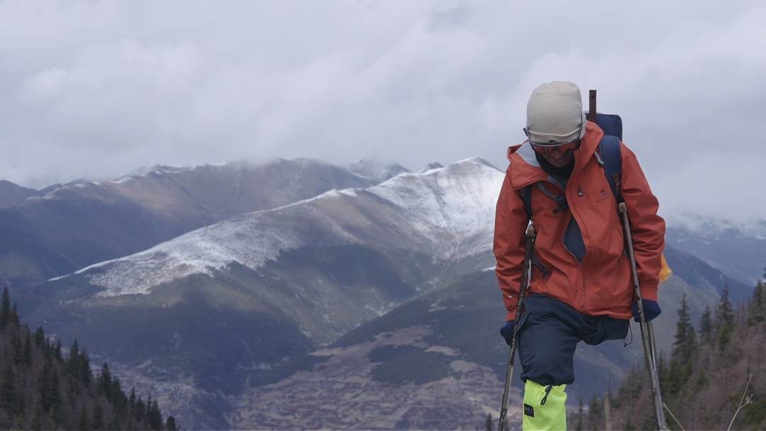40岁的岳楠拄着双拐,站在达古拉峰的漫天风雪中。他的左腿从根部截肢,靠右腿和拐杖支撑着全部身体重量,俯身低头在雪中一次次寻找支点。