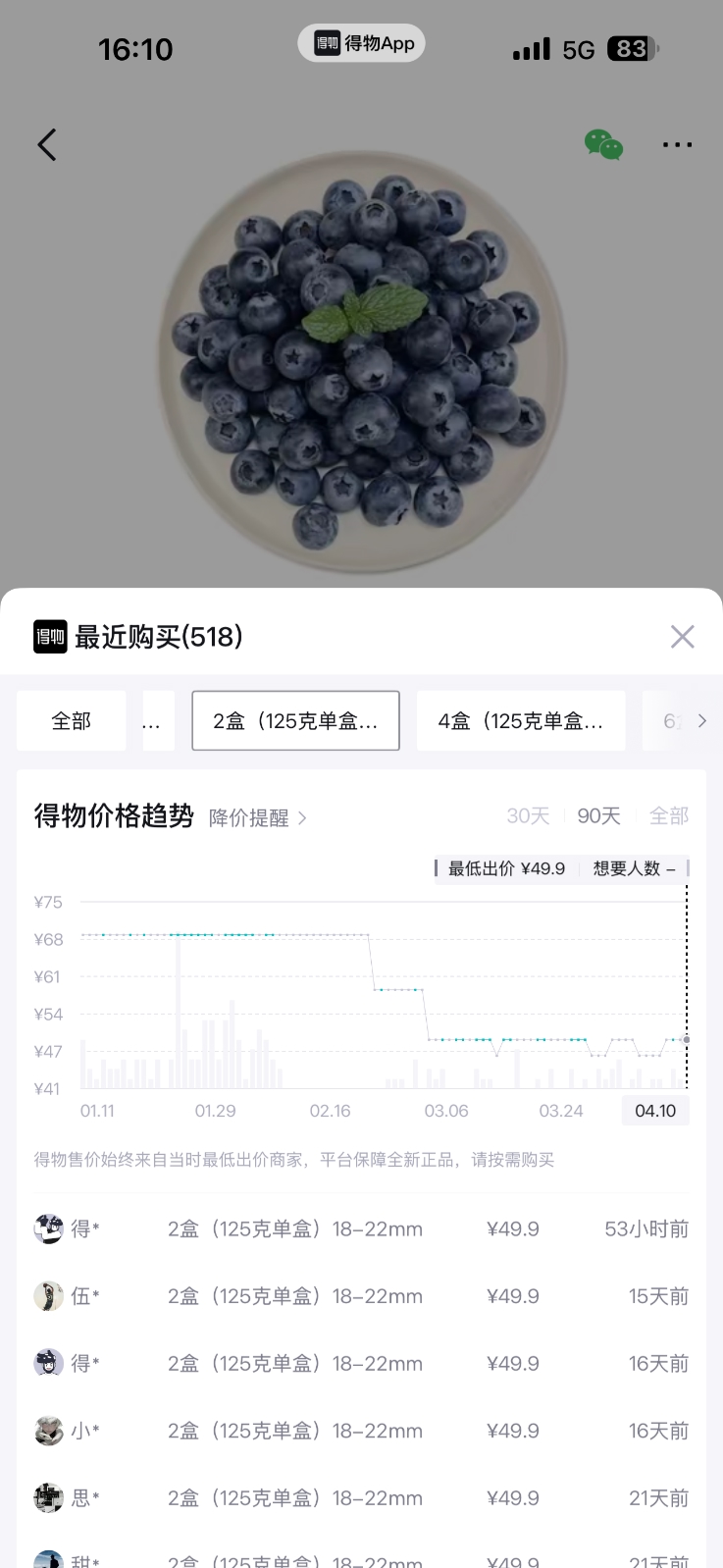 记者发现,这轮蓝莓价格下跌覆盖了不同规格、渠道和时间的全面调整。按规格看大果跌幅更大,从得物平台数据显示,22mm大果径精品花香蓝莓(250g)从69元降至49.9元,跌幅28%;18mm中果径(750g)从152元降至128元,跌幅16%。大果跌幅明显高于中果,说明“大果+精品”高溢价模式受冲击。