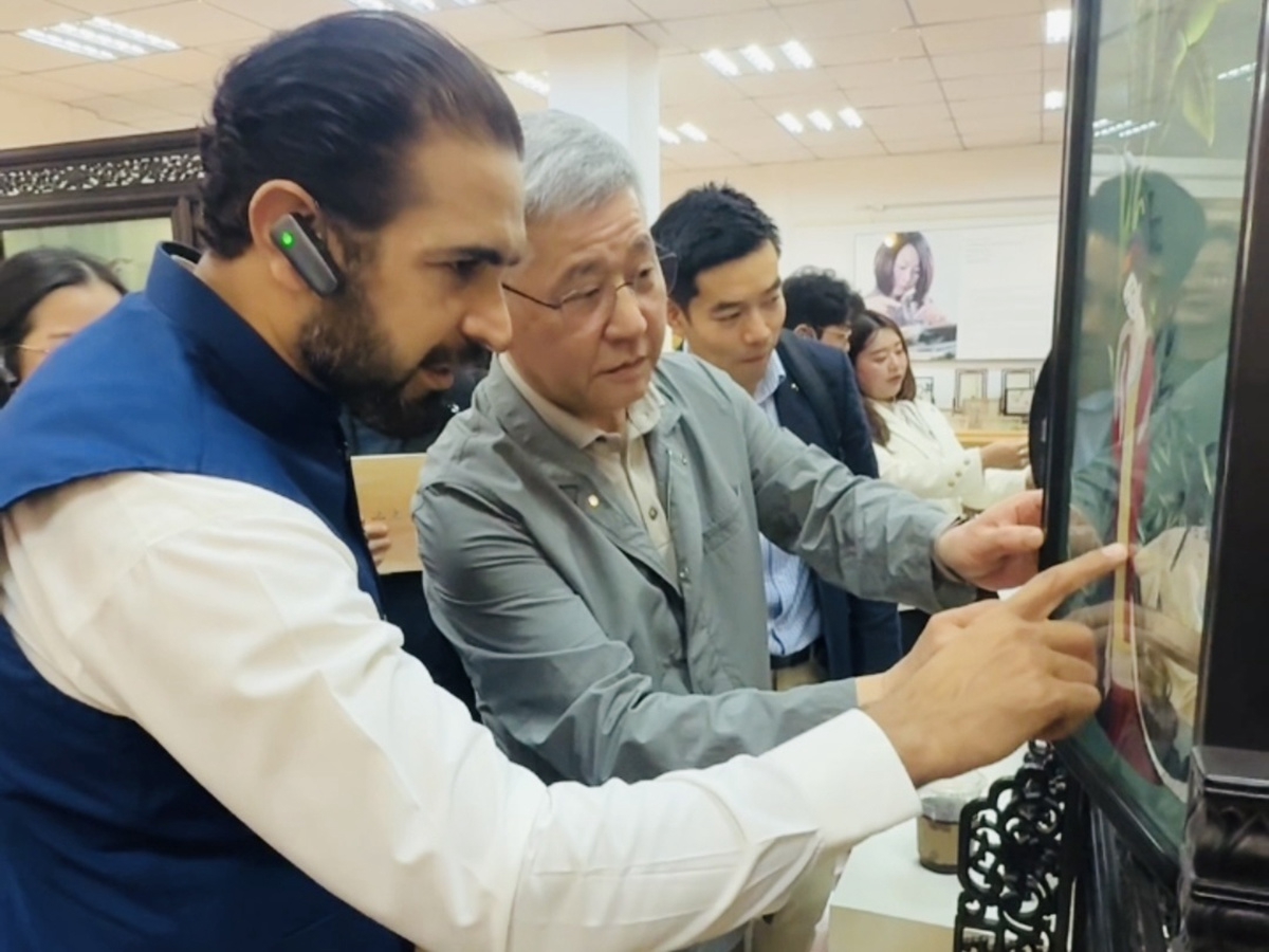 韩国驻成都总领事严元载与巴基斯坦驻成都总领事坦维尔,对蜀绣双面绣兴趣浓厚。