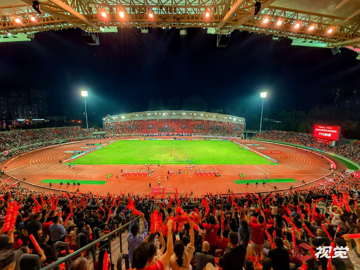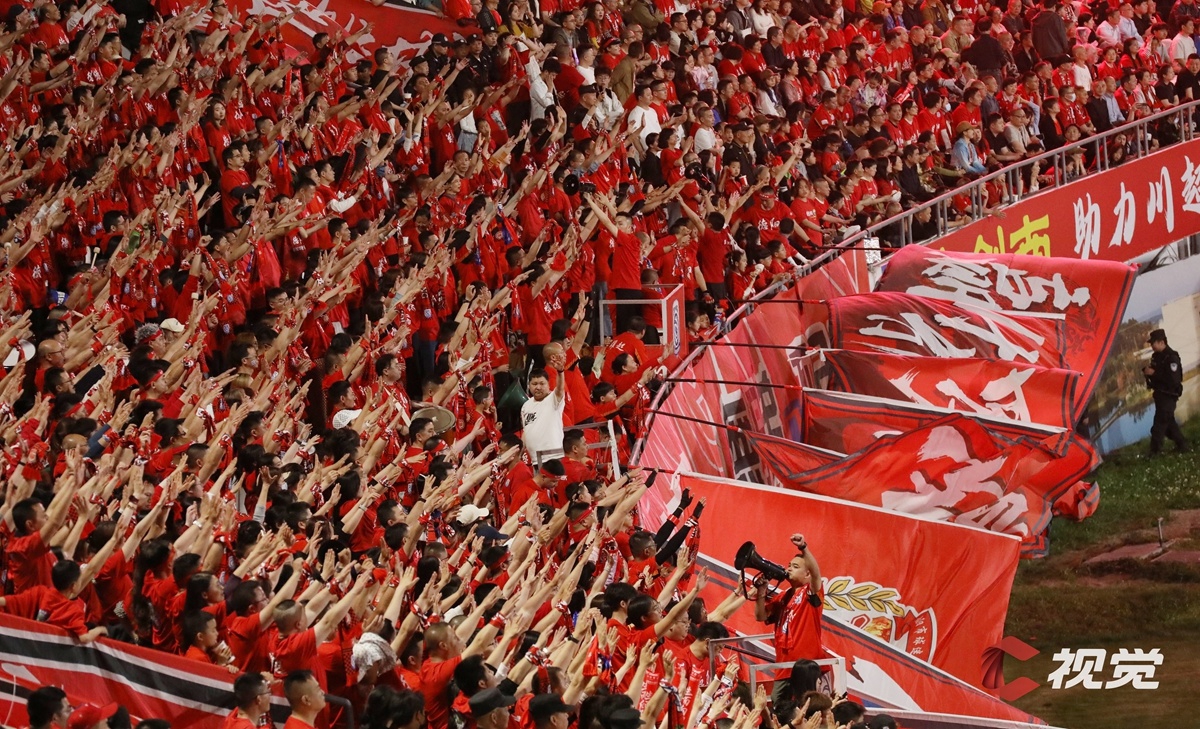 4月11日,“川超”决赛阶段第五轮迎来备受瞩目的“南北”对决,自贡灯城燊龙队坐镇自贡南湖体育中心,迎战绵阳九洲长虹队。图为最强“第十二人”呐喊助威。C视觉签约摄影师 李秋玥 摄