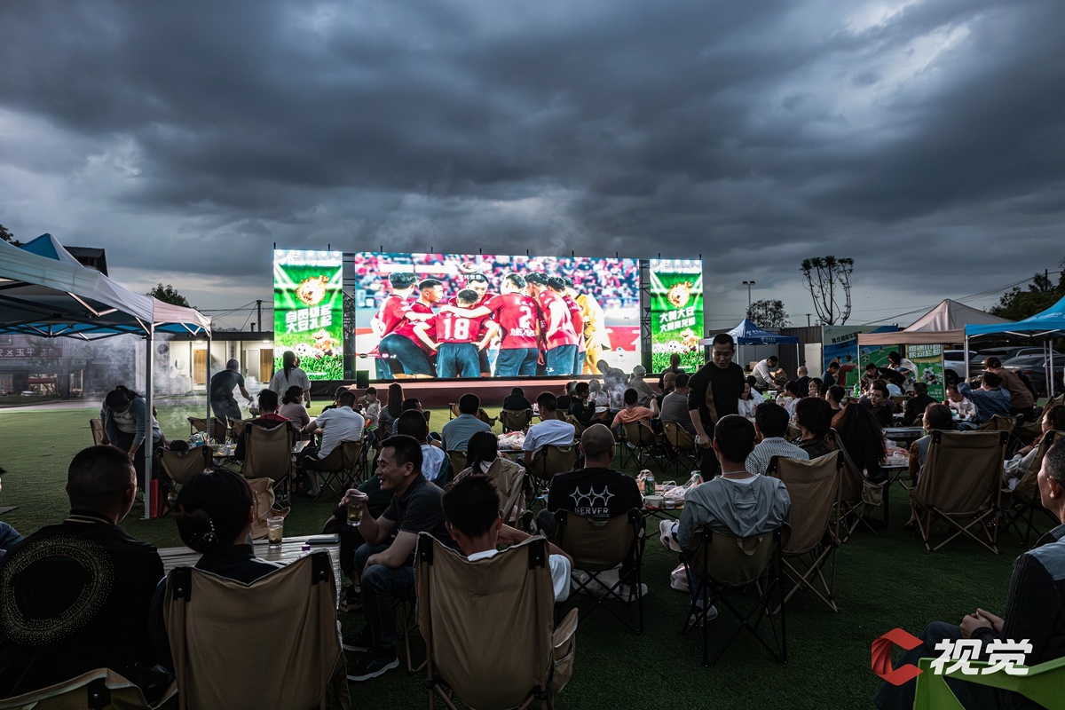 4月11日,“川超”决赛阶段第五轮比赛,自贡灯城燊龙队迎战绵阳九洲长虹队。在自贡青龙湖第二观赛点,不少球迷围坐大屏幕前,一边看比赛一边品美食。C视觉签约摄影师 陈超 摄