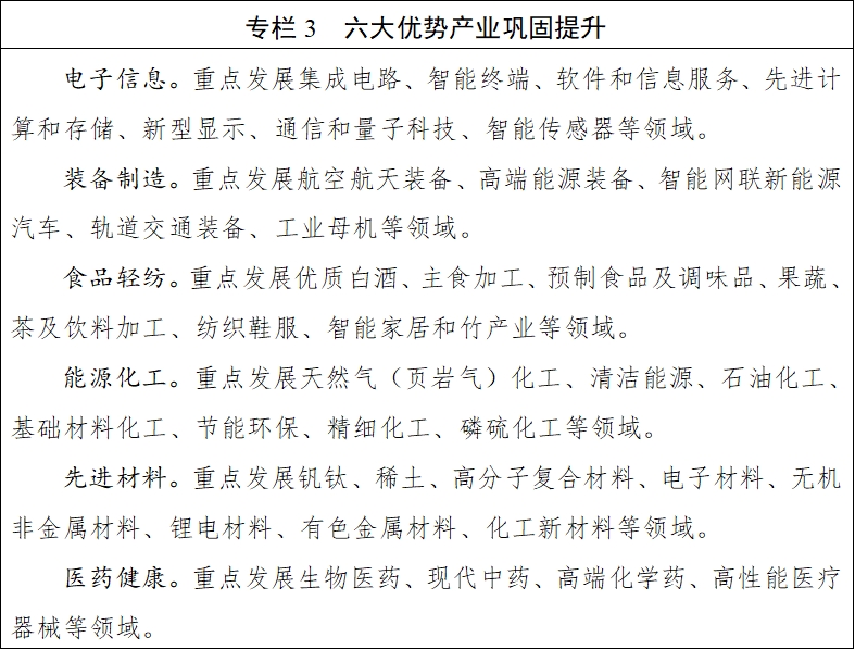 经济综合实力显著提升。经济总量跨过两个万亿元大关、跃升至全国第五位、实现历史性晋位,人均地区生产总值超过1万美元,六大优势产业提质倍增行动深入实施,重点产业建圈强链稳步推进,现代化产业体系加快构建。区域城乡发展更趋协调。成渝地区双城经济圈带动能力明显增强,五大片区协调发展水平持续提升,城乡融合发展扎实推进,粮食等重要农产品保供能力稳步增强,巩固拓展脱贫攻坚成果同乡村振兴有效衔接任务全面落实,39个欠发达县域托底性帮扶成效显著。创新驱动能力明显增强。区域创新布局不断优化,西部首个国家实验室落地运行,一批国省创新平台扩容提质,前沿科技攻坚突破行动启动实施,“四川造”科技成果竞相涌现,高新技术企业数量实现倍增。现代基础设施提档升级。成都天府国际机场等标志性工程建成投用,西部陆海新通道西线主通道四川段全线贯通,通江达海、外畅内联的铁路运输体系加速构建,高速公路通车里程突破1.1万公里,多能互补电源、互联互济电网提速建设,水电装机突破1亿千瓦,引大济岷等重大水利工程启动建设,新型基础设施规模稳步扩大。改革开放取得新的突破。具有四川特色的原创性差异化改革取得标志性成果,以控制成本为核心优化营商环境取得新进展,政务服务“高效办成一件事”提质增效,开放型经济加快发展,进出口总额突破万亿元,成都大运会、世园会、世运会和金熊猫奖等国际赛事与重大活动成功举办。绿色低碳转型步伐加快。碳达峰行动有序实施,美丽四川建设深入推进,污染防治攻坚成效明显,生态保护修复、生物多样性保护全面加强,长江黄河上游生态屏障更加巩固。人民生活品质稳步提高。就业总体稳定,城乡居民收入持续增长,教育、医疗、养老、育幼、社保、体育等民生和社会事业全面进步,文化事业和文旅产业蓬勃发展,攀枝花共同富裕试验区建设取得积极成果。安全稳定基础更加坚实。有效应对新冠疫情冲击、突发自然灾害等重大考验,平安四川建设成效明显,全过程人民民主深入发展,全面依法治省取得新进展,社会治理效能明显增强,社会大局保持和谐稳定。全面从严治党纵深推进。党的创新理论更加深入人心,党的基层组织和党员队伍建设不断加强,正风肃纪反腐一体深化,整治形式主义为基层减负取得扎实成效,良好政治生态持续巩固发展。
