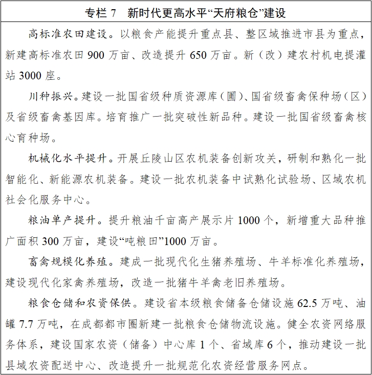 严守耕地保护红线,坚决遏制耕地“非农化”,加强耕地种植用途管控,持续推进耕地数量、质量、生态“三位一体”保护。加强粮食购销和储备管理,优化粮食储备规模品种和结构布局,完善省市县三级储备管理和运行机制,提升“巴蜀粮安”仓储设施保障能力。健全粮食市场监测预警体系,强化粮食应急保障能力。加强能源生产供给,在煤电集中区域、交通运输枢纽布局建设煤炭储备设施,加快储气调峰设施建设。健全能源应急保供机制,加强能源应急保供设施建设,做好迎峰度夏、迎峰度冬和重要时段电力供应保障,提升能源安全保障能力。
