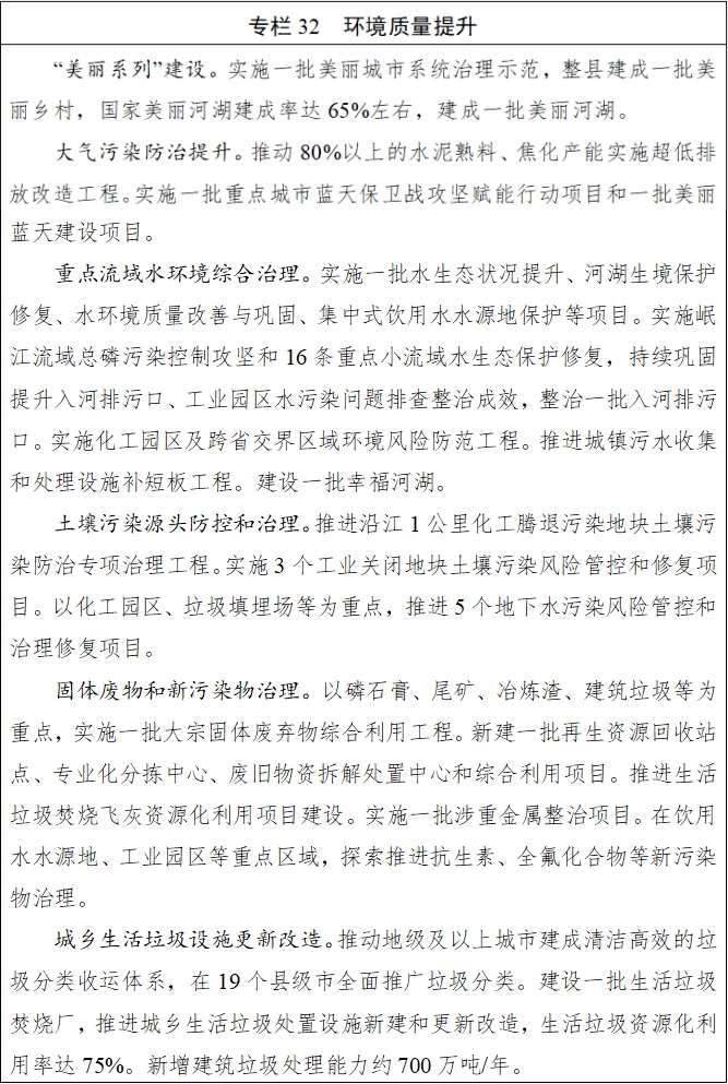 持续改善空气质量,着力降低细颗粒物(PM2.5)浓度,推动氮氧化物和挥发性有机物协同减排。推进工业源、移动源、城乡面源等综合整治,推动重点行业超低排放改造和深度治理,加强挥发性有机物源头替代和全流程治理。强化重点区域、重点时段大气污染防治,精准、科学应对重污染天气,深化区域联防联控。实施美丽蓝天、蓝天赋能等治理项目。全面推进江河湖库保护治理,统筹水资源、水环境、水生态治理,构建重点流域上下游贯通一体的生态治理体系。深化河湖长制工作,推动建设美丽河湖、幸福河湖。深化重点小流域达标攻坚和小微水体治理保护,基本完成入河排污口排查整治,强化城乡生活污水收集处理。深入推进饮用水水源地保护,强化地下水污染源头管控。加强土壤污染源头防控,开展四川省第二次全国土壤污染状况普查,分期分批推进农用地土壤重金属溯源和整治,促进建设用地安全利用。加强噪声污染治理。