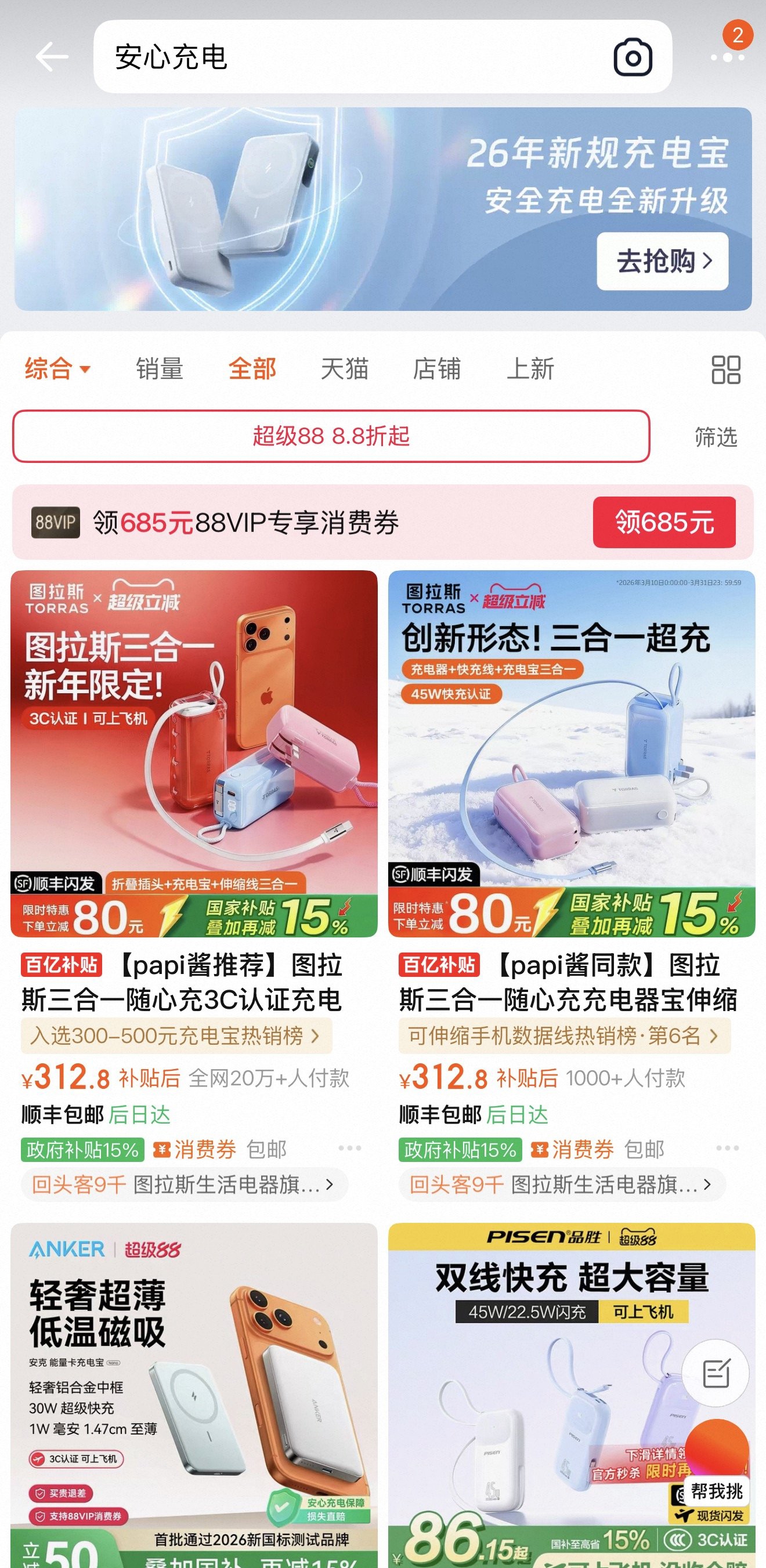 记者注意到,淘宝/天猫平台上搜索“安心充电”,将在搜索结果顶部出现专区入口。4月8日,天猫宣布携手小米、Anker、品胜、绿联、倍思、联想等十余家深度参与标准起草的行业头部品牌,推出“充电宝新规”专区,落实新国标,上新多款合规新品,覆盖不同容量和价位。