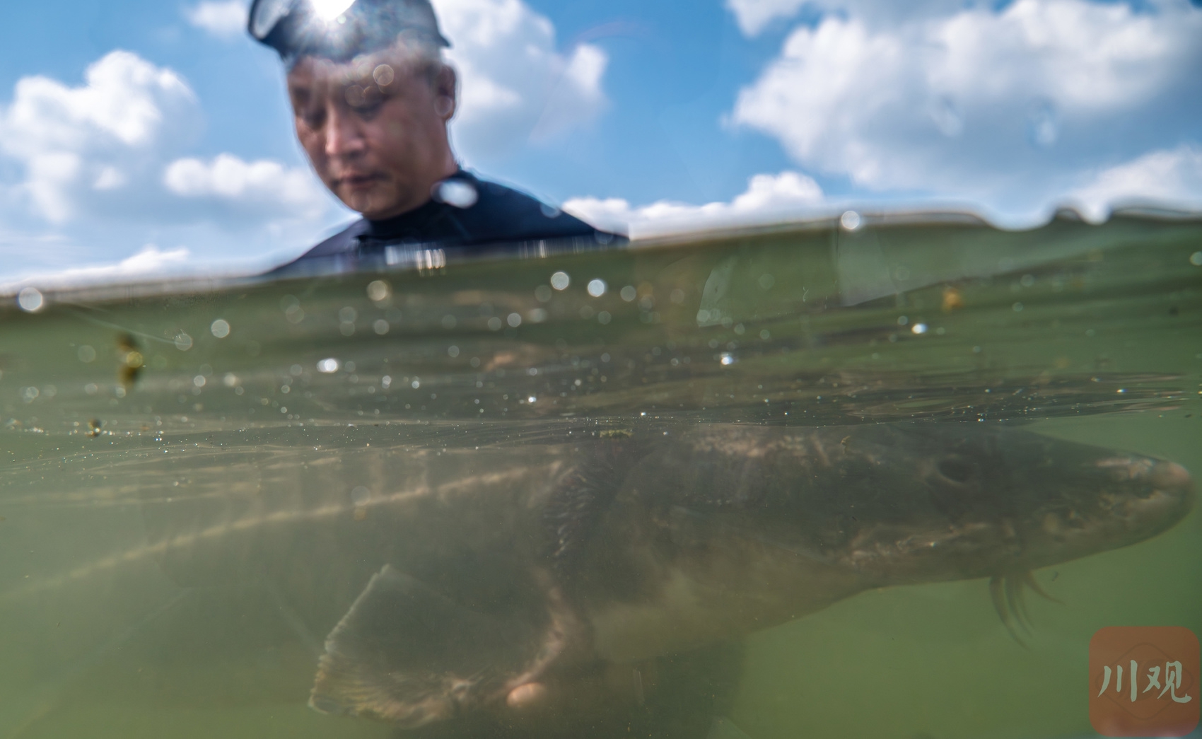科研人员将长江鲟亲鱼放入长江中准备下一步试验。