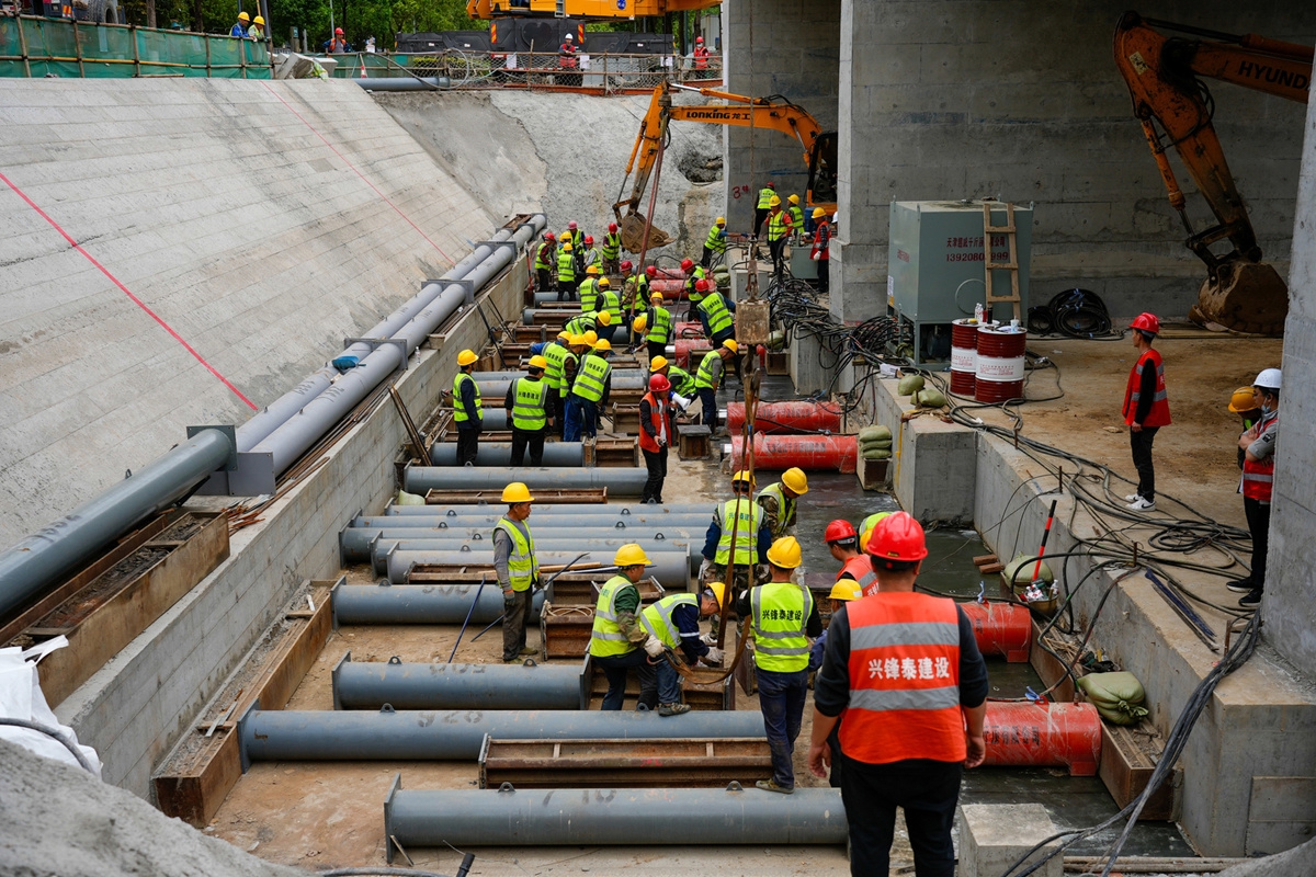 工人们在进行新桥顶进施工