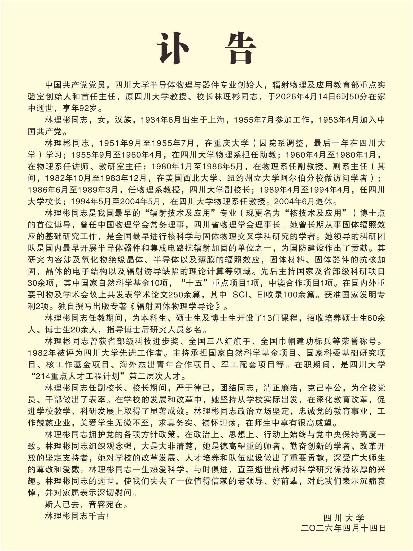 4月14日,记者从四川大学获悉,四川大学半导体物理与器件专业创始人,辐射物理及应用教育部重点实验室创始人和首任主任,原四川大学教授、校长林理彬同志,于今日6时50分在家中逝世,享年92岁。