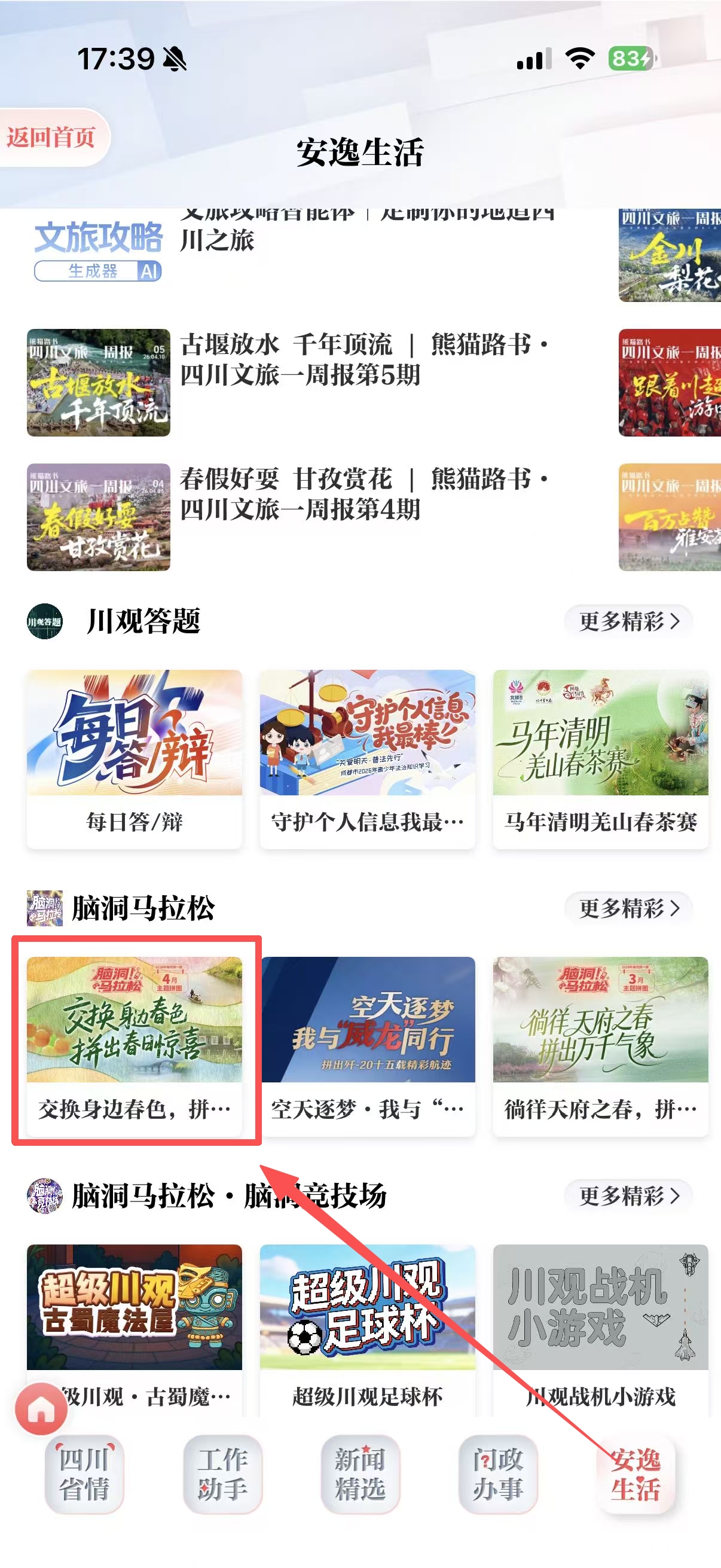 方式二:在川观新闻首页,点击右下角安逸生活,在脑洞马拉松找到“交换身边春色 拼出春日惊喜”拼图小游戏,点击即可参与;