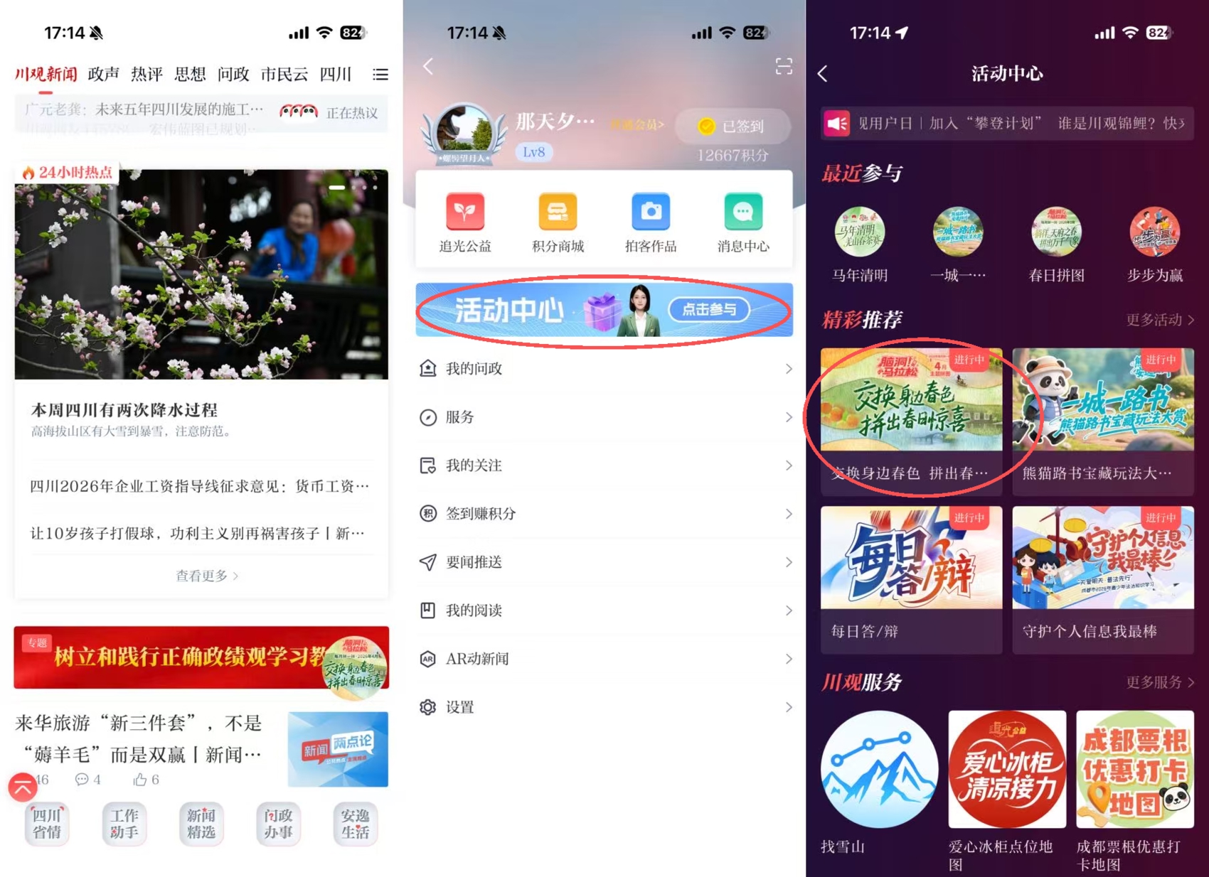 方式三:在川观新闻首页,点击右上角“我的”,再点击“活动中心”,找到“交换身边春色 拼出春日惊喜”活动图片,点击即可参与;