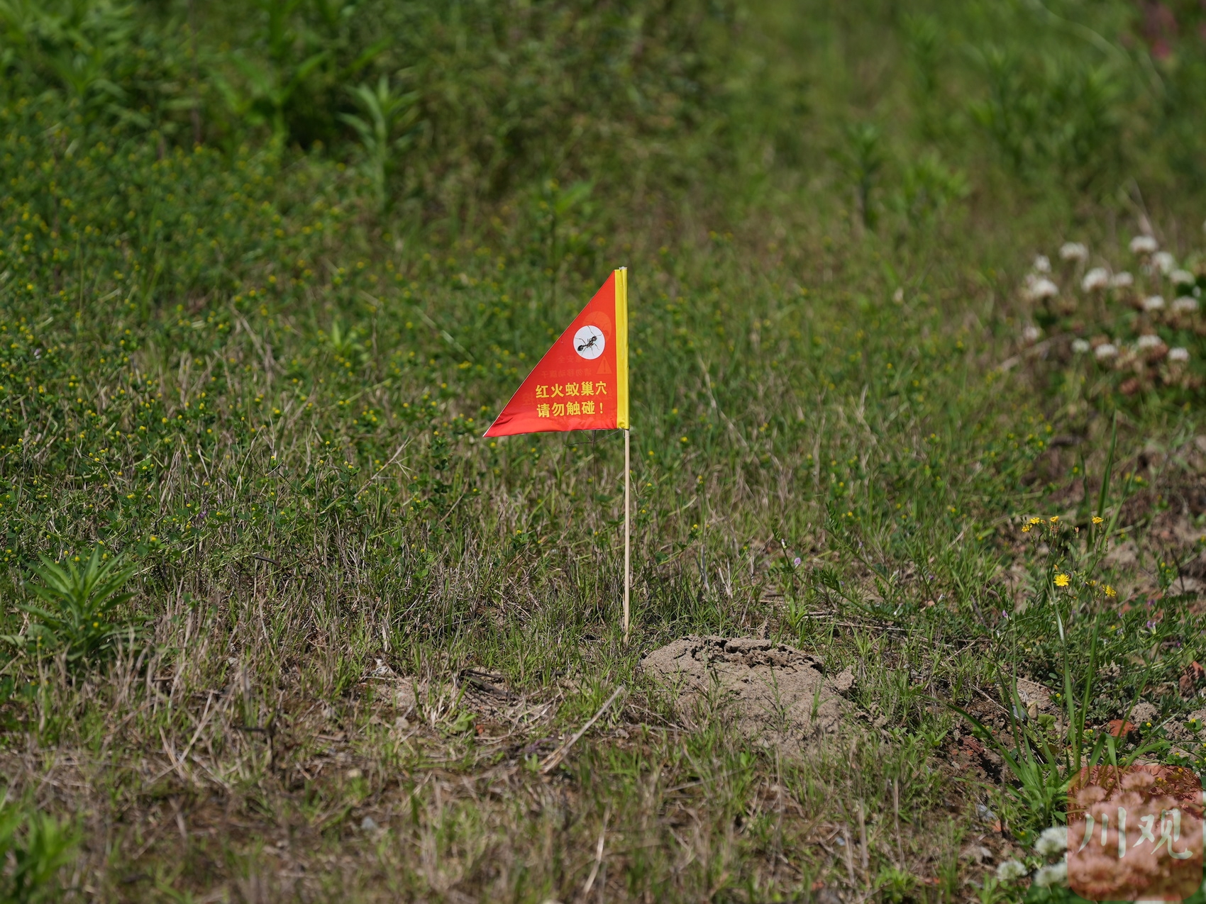 随着气温回暖,外来入侵物种红火蚁逐渐进入活跃期。4月14日,四川在线记者在绕城高速内侧锦江绿道边的一片绿地上观察到,不少土堆上插有小旗,旗面印有蚂蚁图案及“红火蚁监控防控”等警示文字。