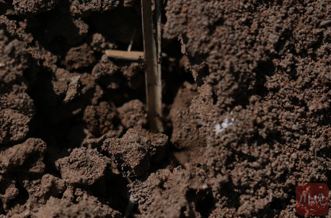 红火蚁通过洞穴的孔洞进出攀爬。