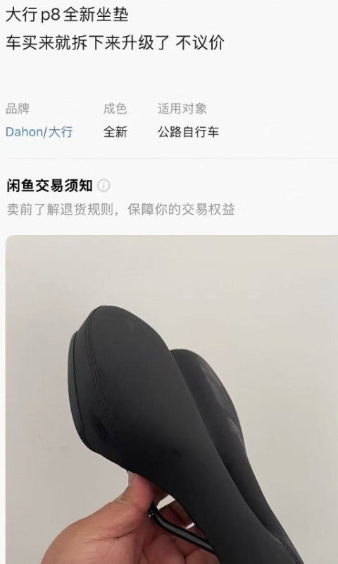 事情还要追溯到2025年5月。报道指出,熊先生是一位骑行爱好者,有十多年的骑行经历。他在淘宝一店铺花3268元买了一辆大行(DAHON)P8折叠自行车,因为想升级坐垫,便把原装坐垫拆了下来,顺手挂在了闲鱼上,标价50元。商品描述写着“大行P8全新坐垫,车买来就拆下来升级了,不议价。”没过几天,坐垫就被一位福建买家拍下。