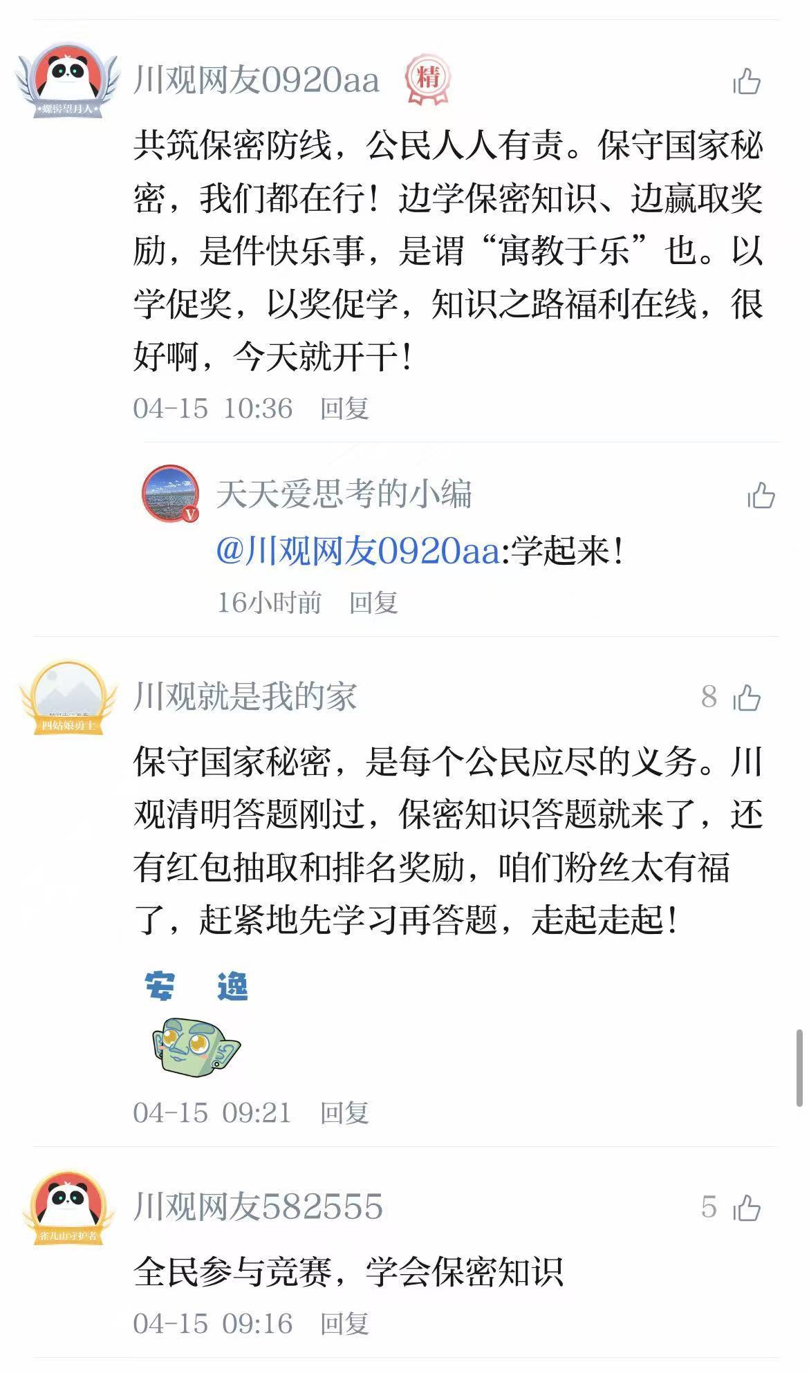 本次答题围绕《中华人民共和国保守国家秘密法》及其实施条例、总体国家安全观、红色保密史等重点内容展开,既是一次全民保密普法,也是一场线上知识比拼。“‘天府密语’答题,开启学习新模式”“‘天府密语’太巴适,既享福利又学知识,参与全民保密普法,共筑全民保密防线”……活动上线后,不少网友在川观新闻App留言。